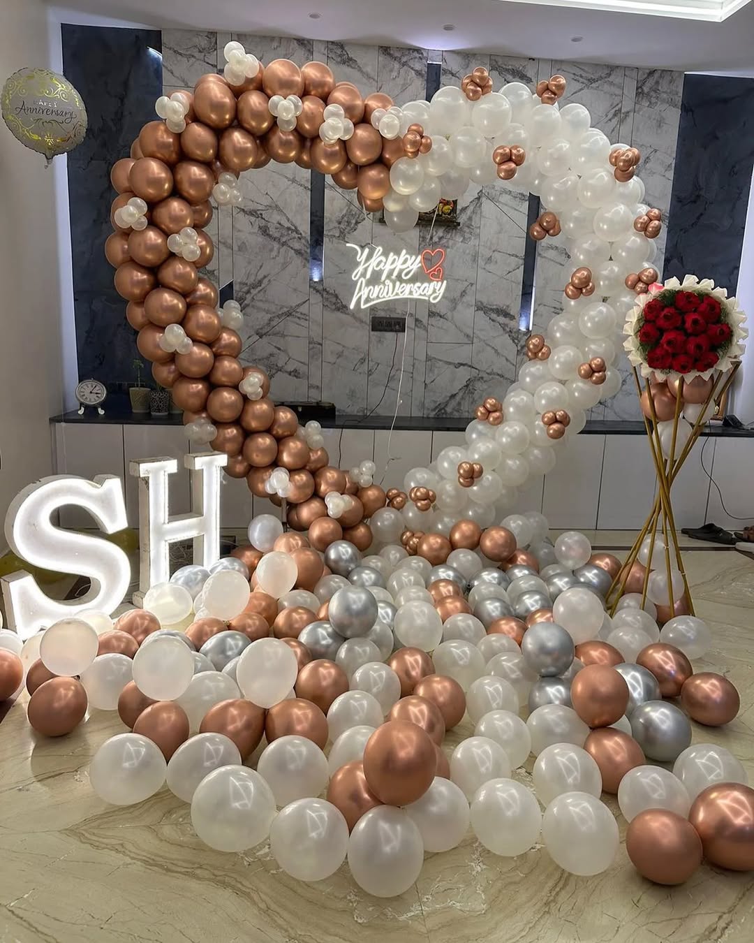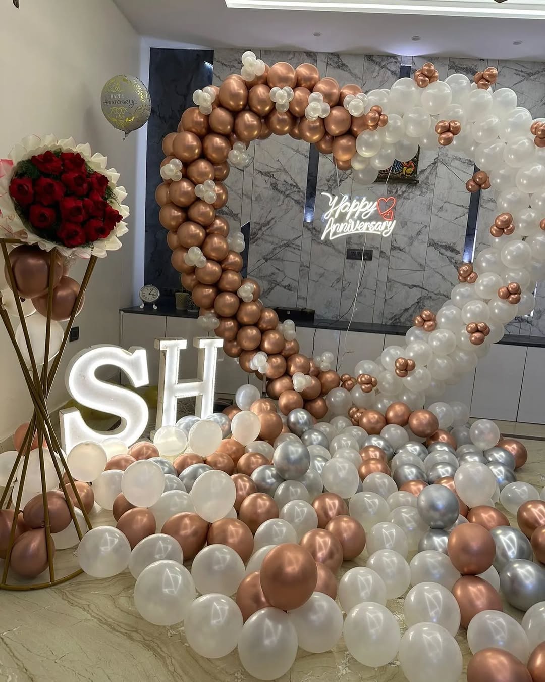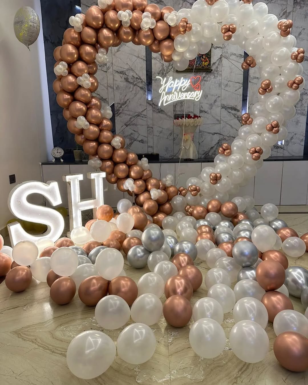 Celebrate love with this luxurious heart-shaped balloon decor—a perfect backdrop for anniversaries, proposals, and romantic surprises. This setup features a stunning heart-shaped balloon arch in metallic rose gold and pearl white, enhanced with a "Happy Anniversary" neon sign and LED initials for...
