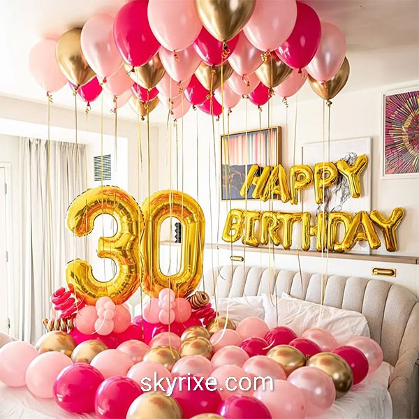 Celebrate a milestone birthday in style with this vibrant hot pink, blush and gold bedroom balloon décor. Featuring a luxurious ceiling of helium balloons with cascading ribbons, bold gold “30” foil numbers, and a bed filled with coordinated balloons, this setup creates a dreamy surprise atmosphe...
