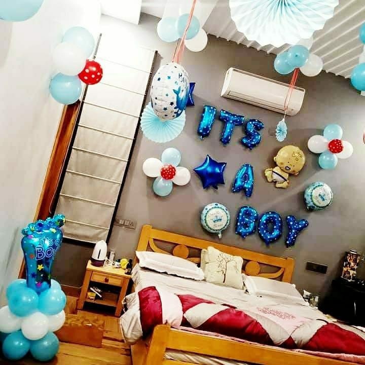 ✯✯This adorable blue and white balloon decoration is designed to welcome a newborn baby boy with warmth and joy. The room is decorated with "IT'S A BOY" letter balloons, star-shaped foil balloons, baby-themed elements, and balloon flowers on the wall. The ceiling is adorned with hanging balloons ...
