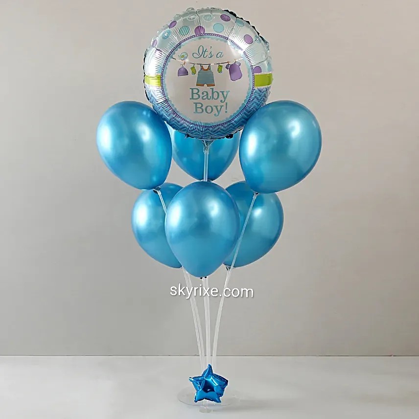 A cheerful blue-themed balloon bouquet featuring a cute “It’s a Baby Boy!” foil balloon paired with glossy blue latex balloons and a star base. Perfect for welcoming a newborn, hospital room décor, baby announcement surprises, or naming ceremony celebrations.