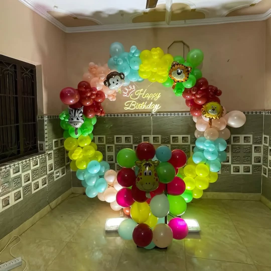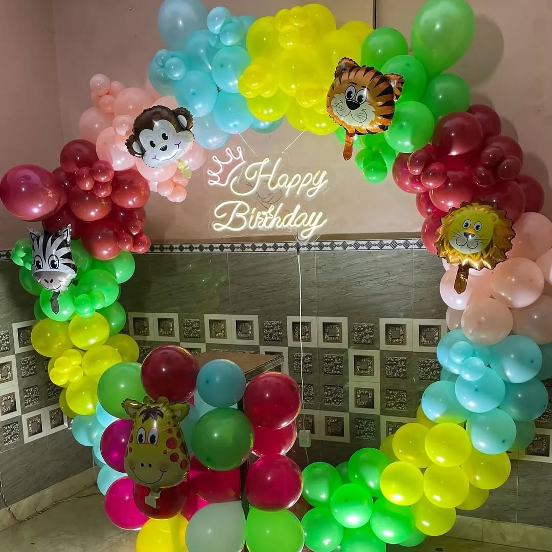 This design features a vibrant jungle-themed balloon arch, perfect for a kids' birthday party. The colorful balloons, animal face foil balloons (zebra, monkey, lion, tiger, and giraffe), and the "Happy Birthday" neon sign create a lively and fun atmosphere. The arch is further complemented by a f...