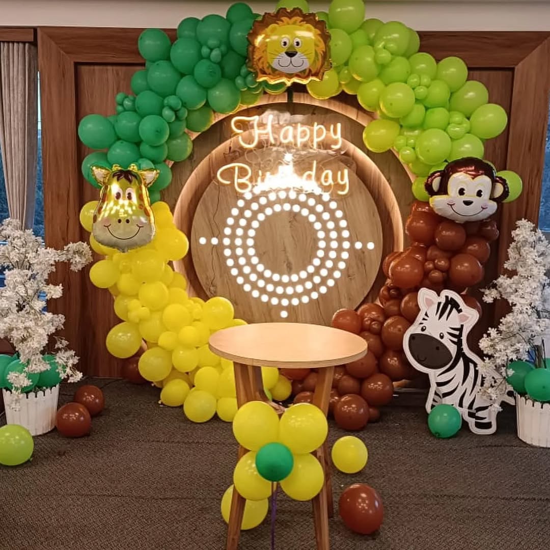 Transform your child’s birthday party into a wild jungle adventure with this Jungle Safari Balloon Backdrop! Featuring adorable animal balloons (lion, giraffe, monkey, zebra), a green and yellow balloon arch, and a "Happy Birthday" neon sign, this setup creates the perfect themed celebration. Des...