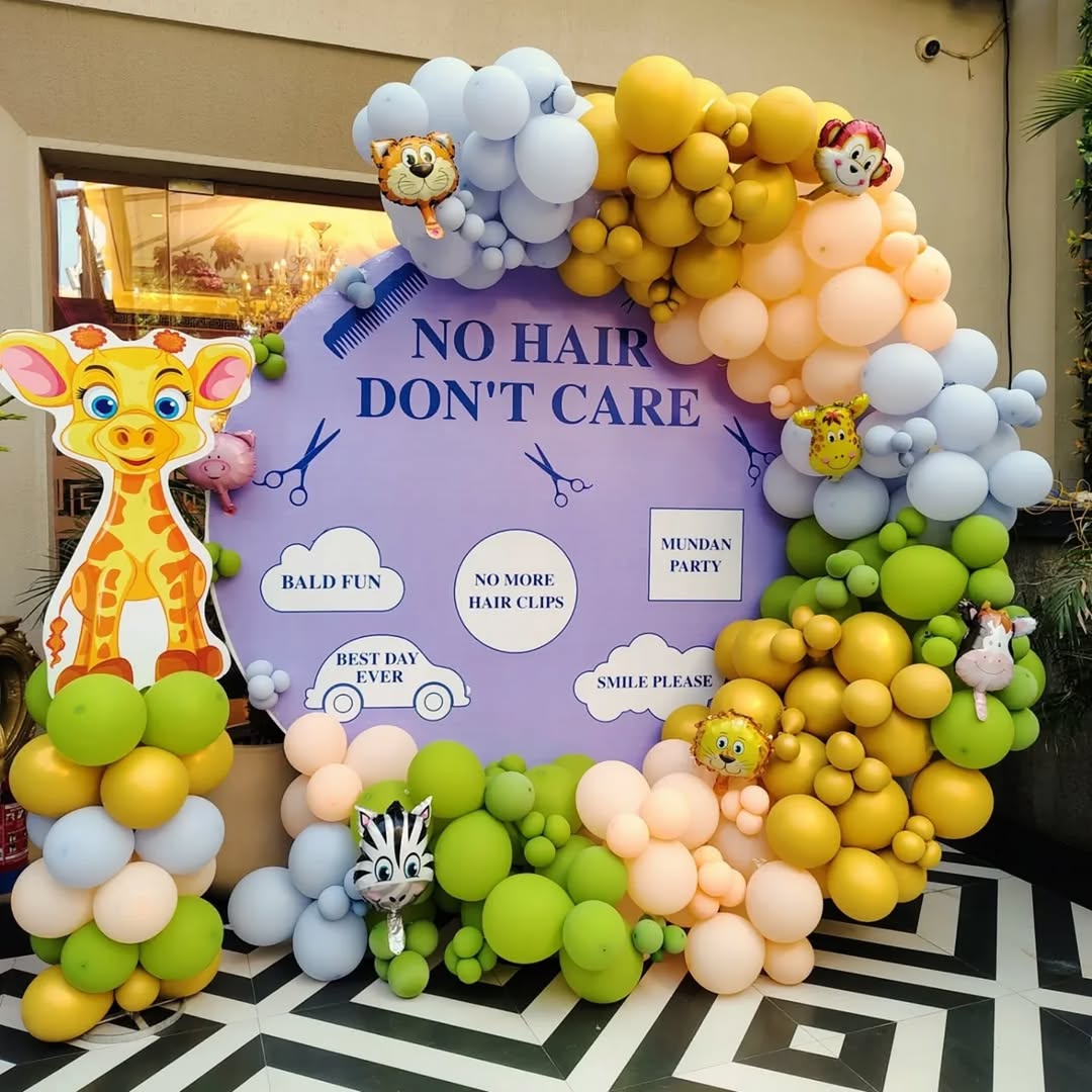 This vibrant and playful balloon decor is perfect for a Mundan ceremony, traditionally celebrating a child's first haircut. The central backdrop carries a humorous and cheerful message: "No Hair, Don't Care." The jungle theme is brought to life using a pastel balloon arch with dominant green, yel...