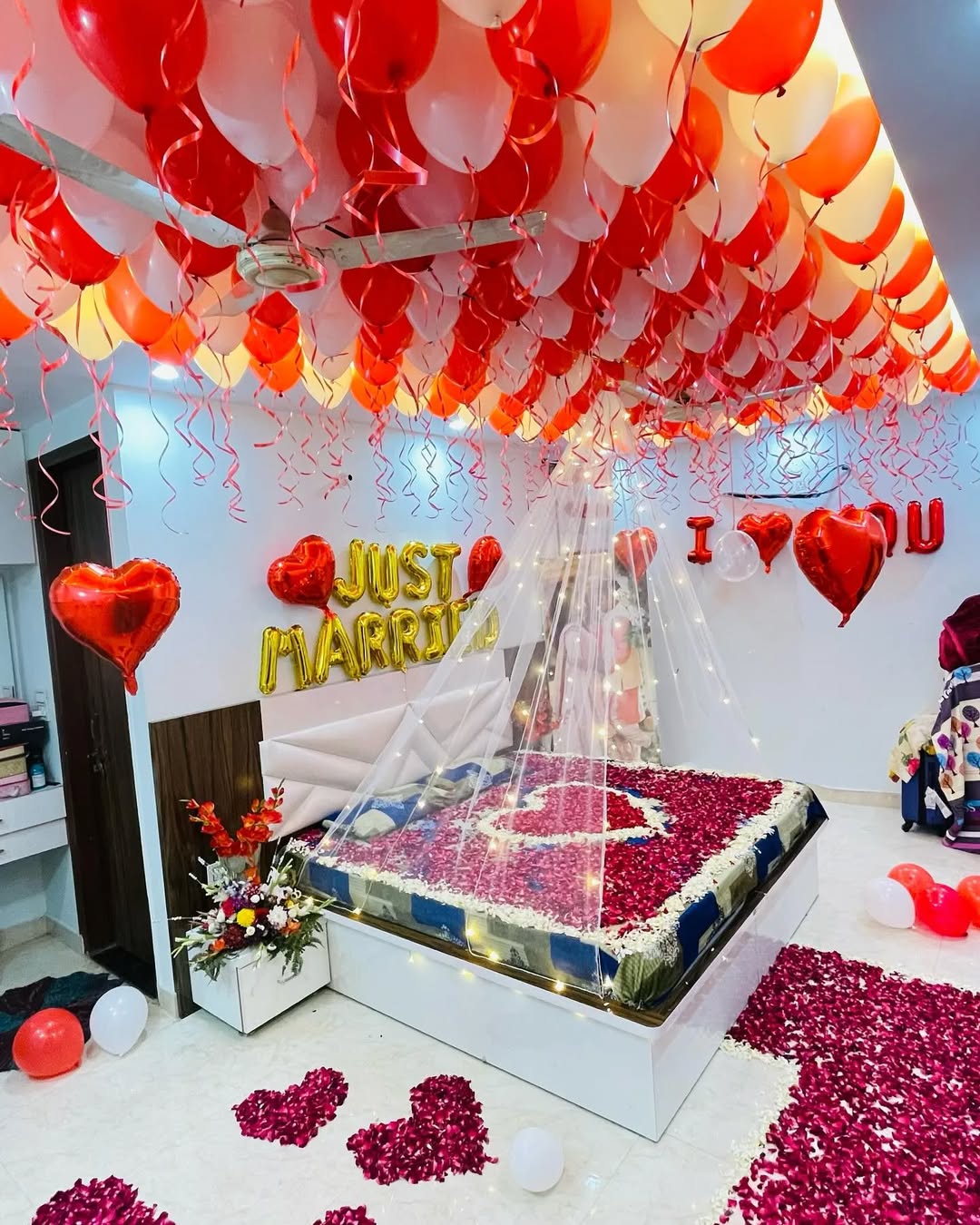 This breathtaking "Just Married" Romantic Room Decor is designed for newlyweds and couples celebrating special moments like wedding nights, anniversaries, or Valentine's Day. The room features a dreamy canopy over the bed with warm fairy lights, ceiling balloons in red and white, and heart-shaped...