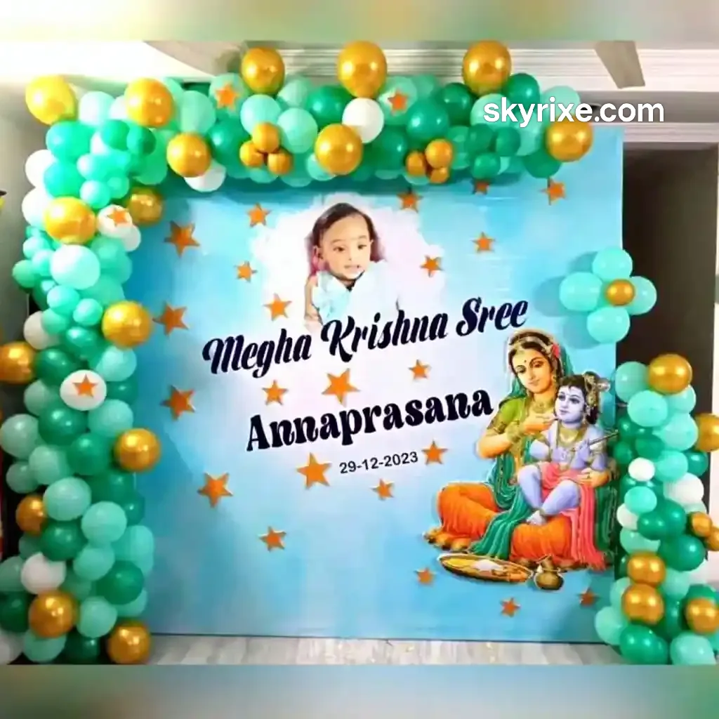 Celebrate your baby’s Annaprashan ceremony with a divine and cultural touch using this Krishna Theme Decoration Setup. Designed with a soothing aqua-blue backdrop, vibrant green balloons, and gold accents, this setup beautifully blends spirituality with modern décor.
