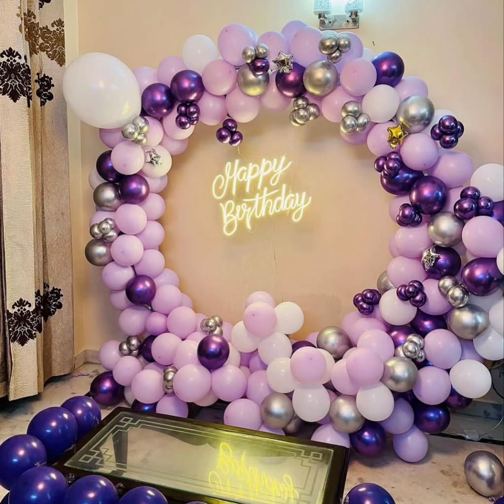 This luxurious and elegant birthday decoration features a circular balloon arch in stunning shades of lavender, deep purple, silver, and white. The arrangement is complemented by mini silver and star-shaped balloons to add texture and depth. A neon "Happy Birthday" sign in the center enhances the...