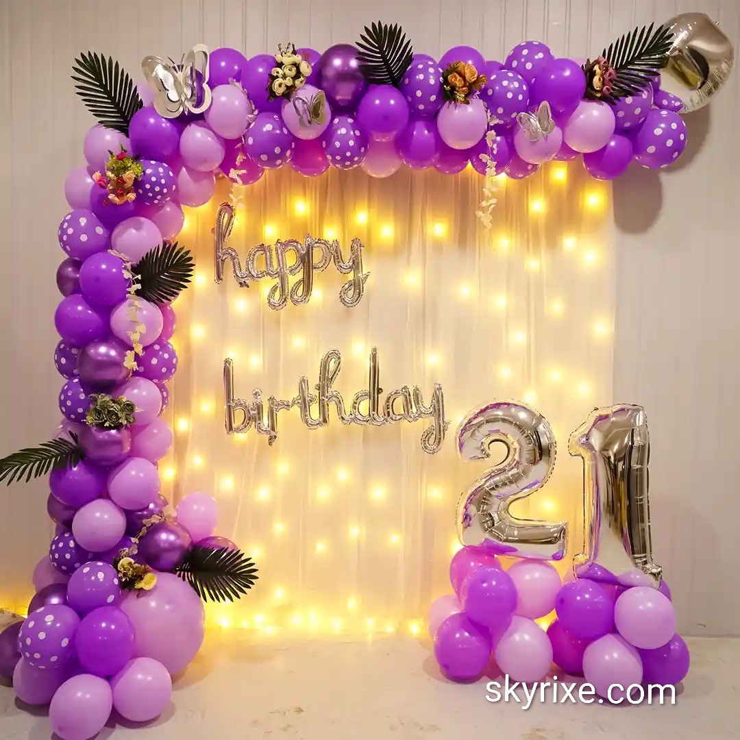 The soft golden glow behind the pastel-purple balloon arch creates a magical photo-ready birthday corner. The milestone “21” highlight makes the celebrant feel special while guests enjoy a stylish backdrop for pictures and memories. Ideal for intimate home parties or event venues seeking a classy...