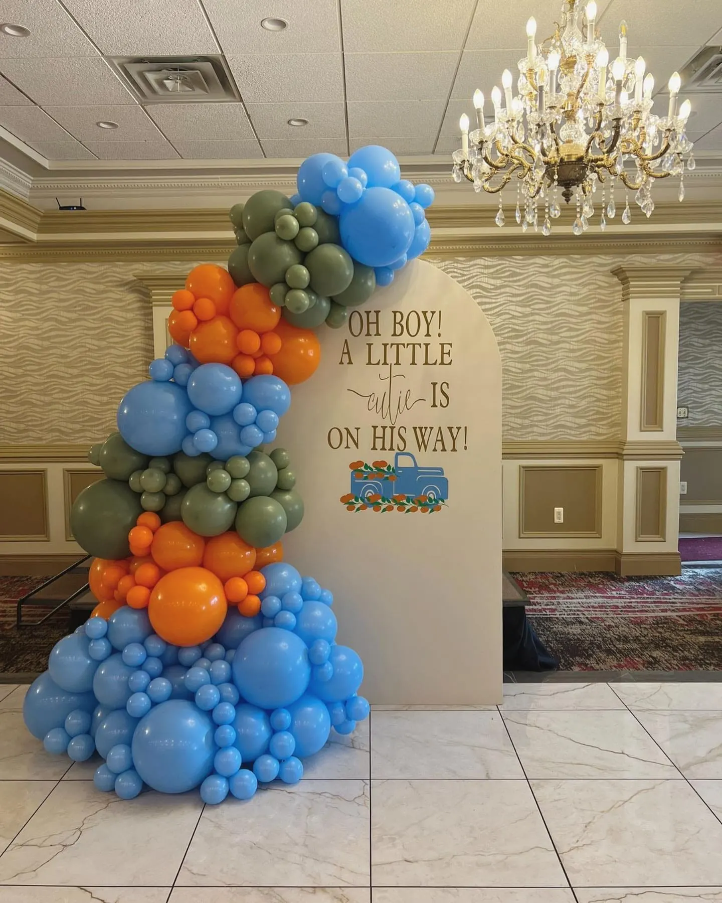 This rustic and autumn-inspired balloon arrangement features a stunning mix of sky blue, olive green, and burnt orange balloons cascading from an elegant cream-colored backdrop. The gold-accented lettering, which reads "Oh Boy! A Little Cutie is on His Way!", adds a warm and personal touch, while...