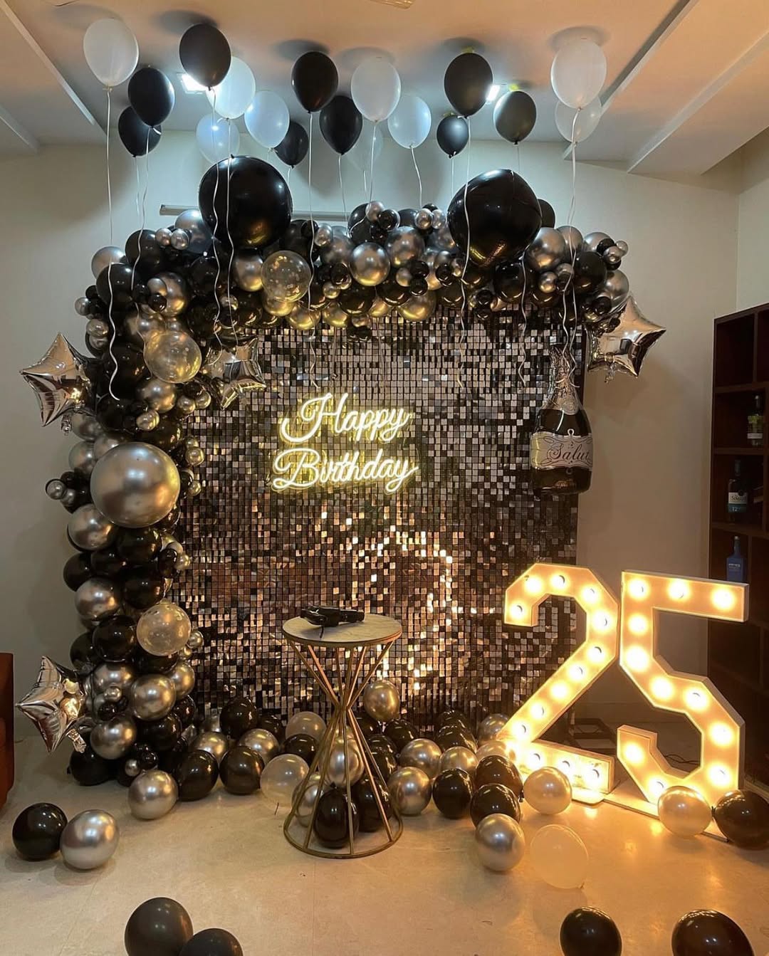 *️⃣This is a high-end, glamorous birthday backdrop featuring black, silver, and metallic elements. The focal point is a shimmering silver sequin wall, accentuated with a mix of black and silver *️⃣balloons. A neon "Happy Birthday" sign adds elegance, while a large illuminated "25" stands out for ...
