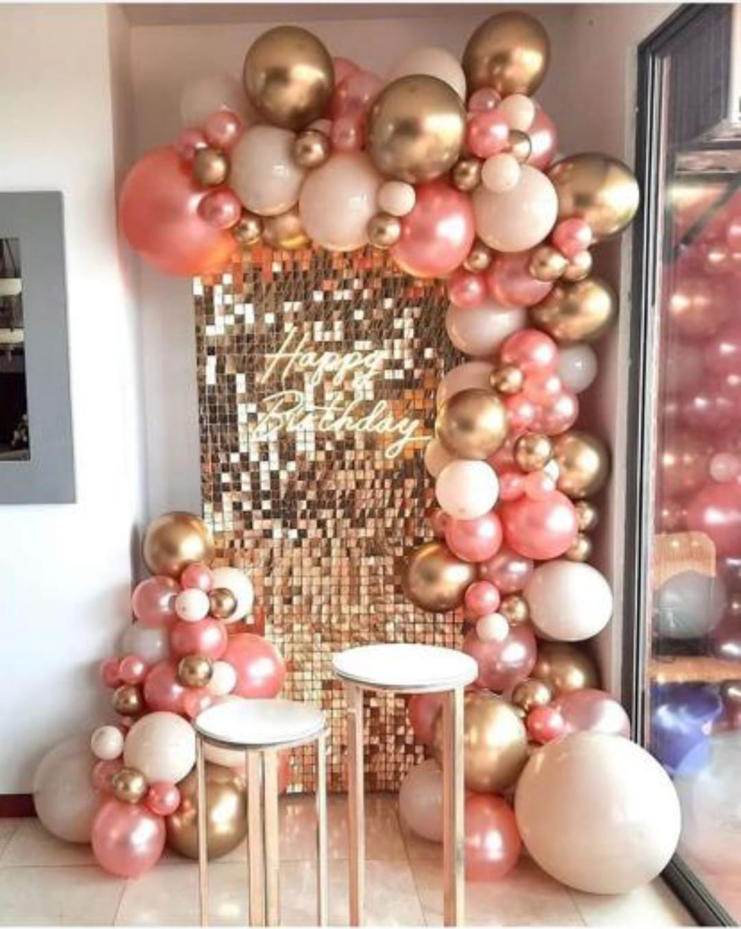 This elegant and luxurious balloon décor setup is perfect for a birthday celebration, featuring a gold, blush pink, and white color theme. The shimmering gold sequin backdrop adds a glamorous effect, making it ideal for high-end parties, milestone birthdays, and elegant gatherings. The or...