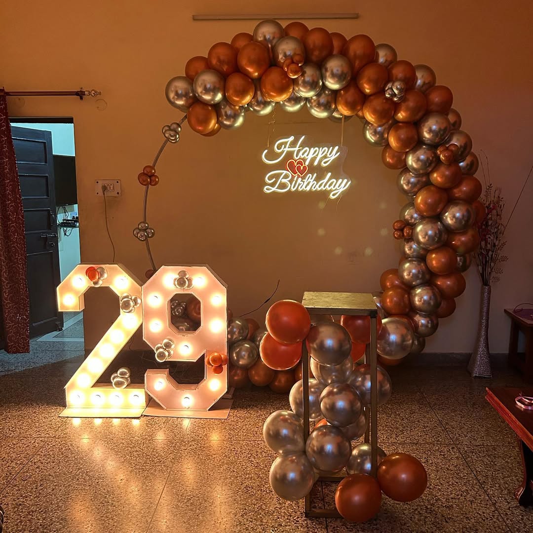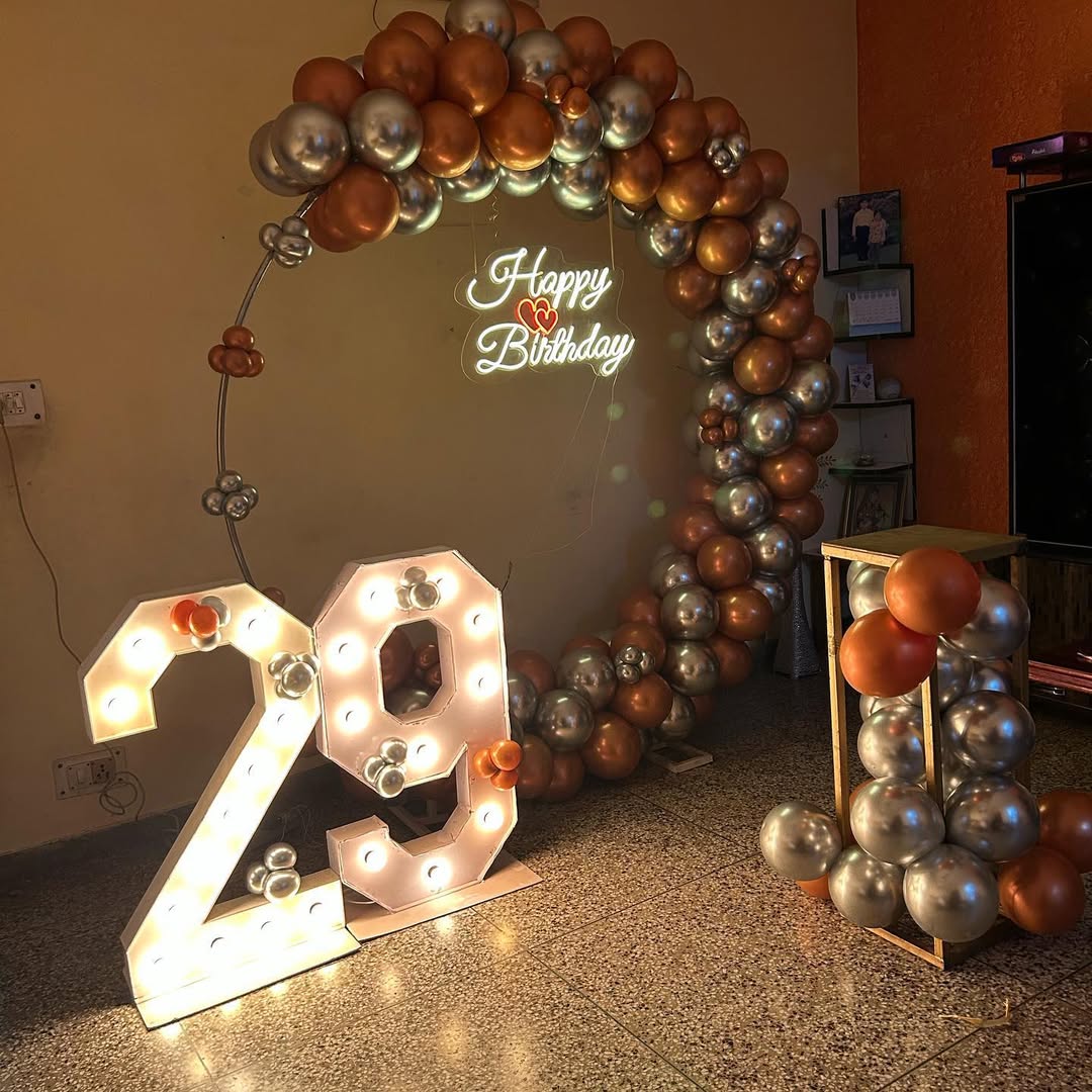 *️⃣ This luxurious birthday décor features an elegant metallic balloon arch in gold and silver tones, a neon "Happy Birthday" sign, and illuminated marquee numbers showcasing the age. The setup *️⃣includes a modern pedestal balloon stand for added sophistication. The combination of warm ligh...