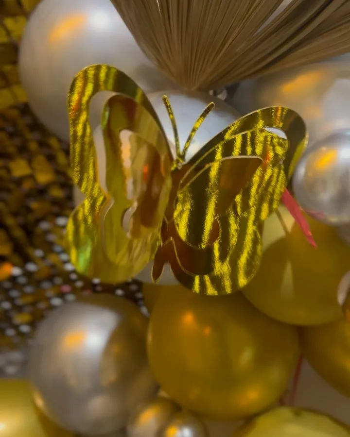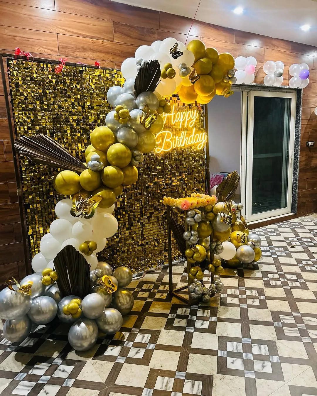 *️⃣This luxury-themed birthday balloon setup features an elegant gold and silver color palette. The organic balloon arch is asymmetrical, giving a modern and sophisticated look. The backdrop is *️⃣covered with golden shimmer panels, which reflect light beautifully, making it perfect for photos an...