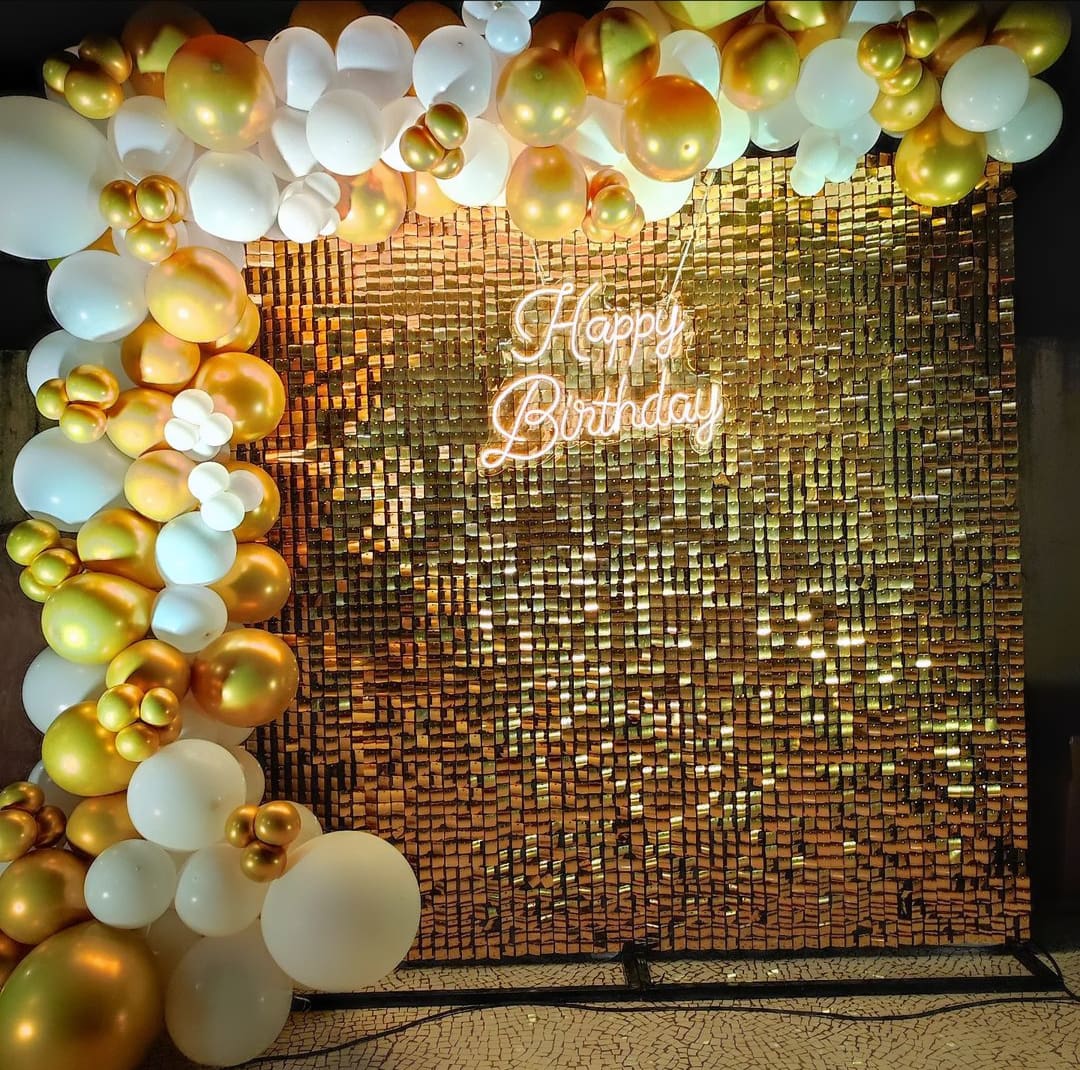 ✯✯This stunning birthday setup features a gold and white balloon arch beautifully arranged around a gold sequin shimmer wall, creating a luxurious and glamorous look. The "Happy Birthday" neon sign adds a modern ...
