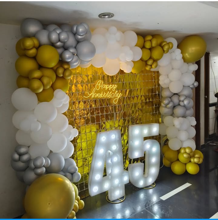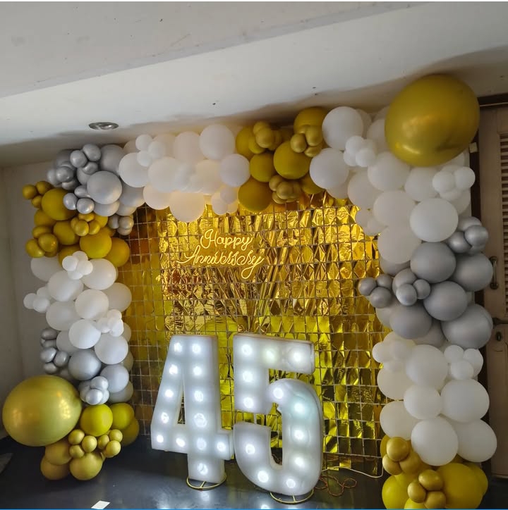 This stunning anniversary backdrop features an elegant combination of gold, white, and silver balloons arranged beautifully around a gold shimmer wall. The LED-lit numbers "45" and "Happy Anniversary" neon sign make it a grand and glamorous celebration setup.