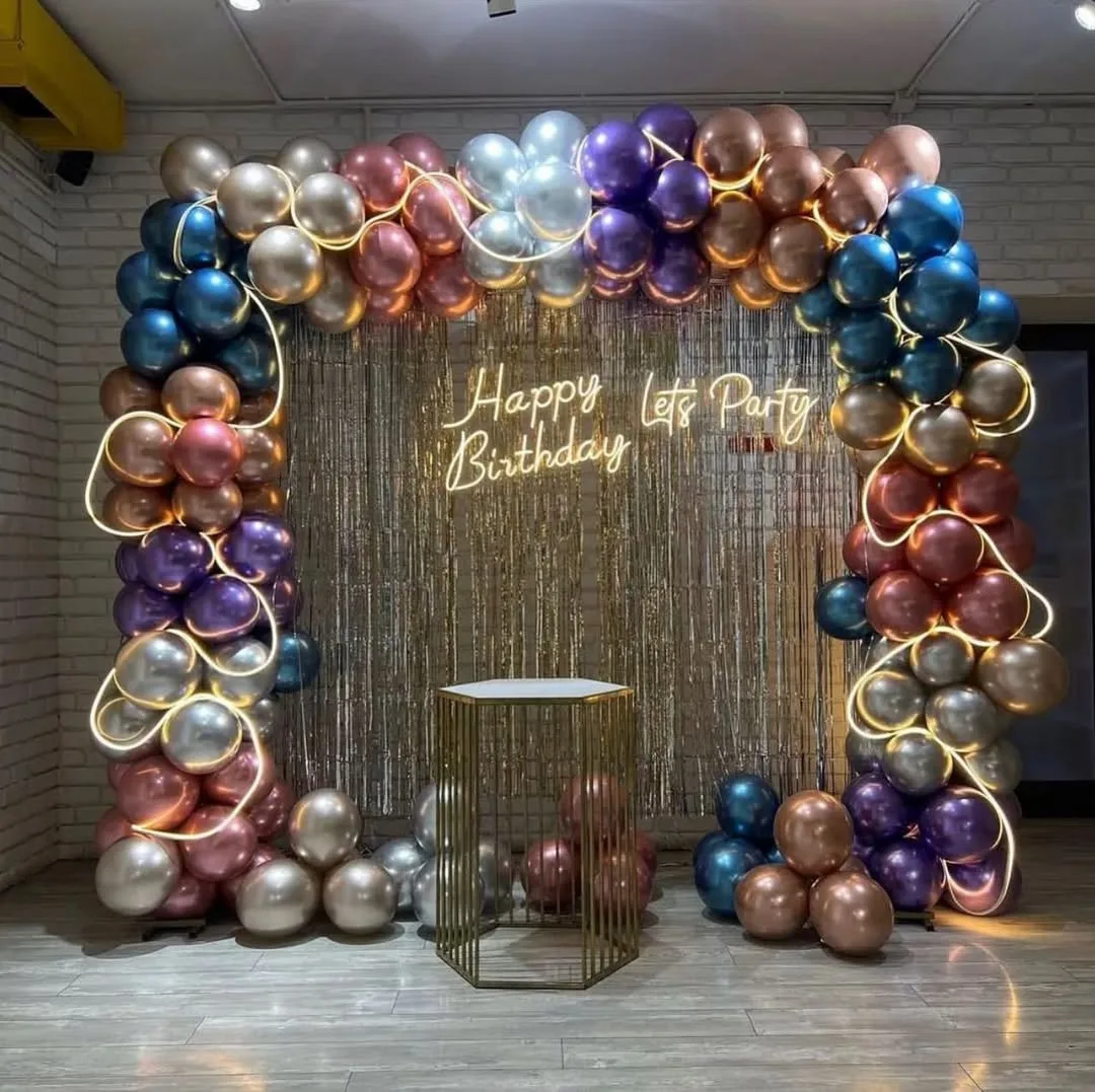 *️⃣This sophisticated birthday backdrop features an elegant metallic balloon arch with a shimmering tinsel curtain and a glowing "Happy Birthday Let's Party" neon sign. The warm LED rope lights *️⃣intertwined with the balloon garland enhance the luxurious and festive atmosphere. A stylish golden ...