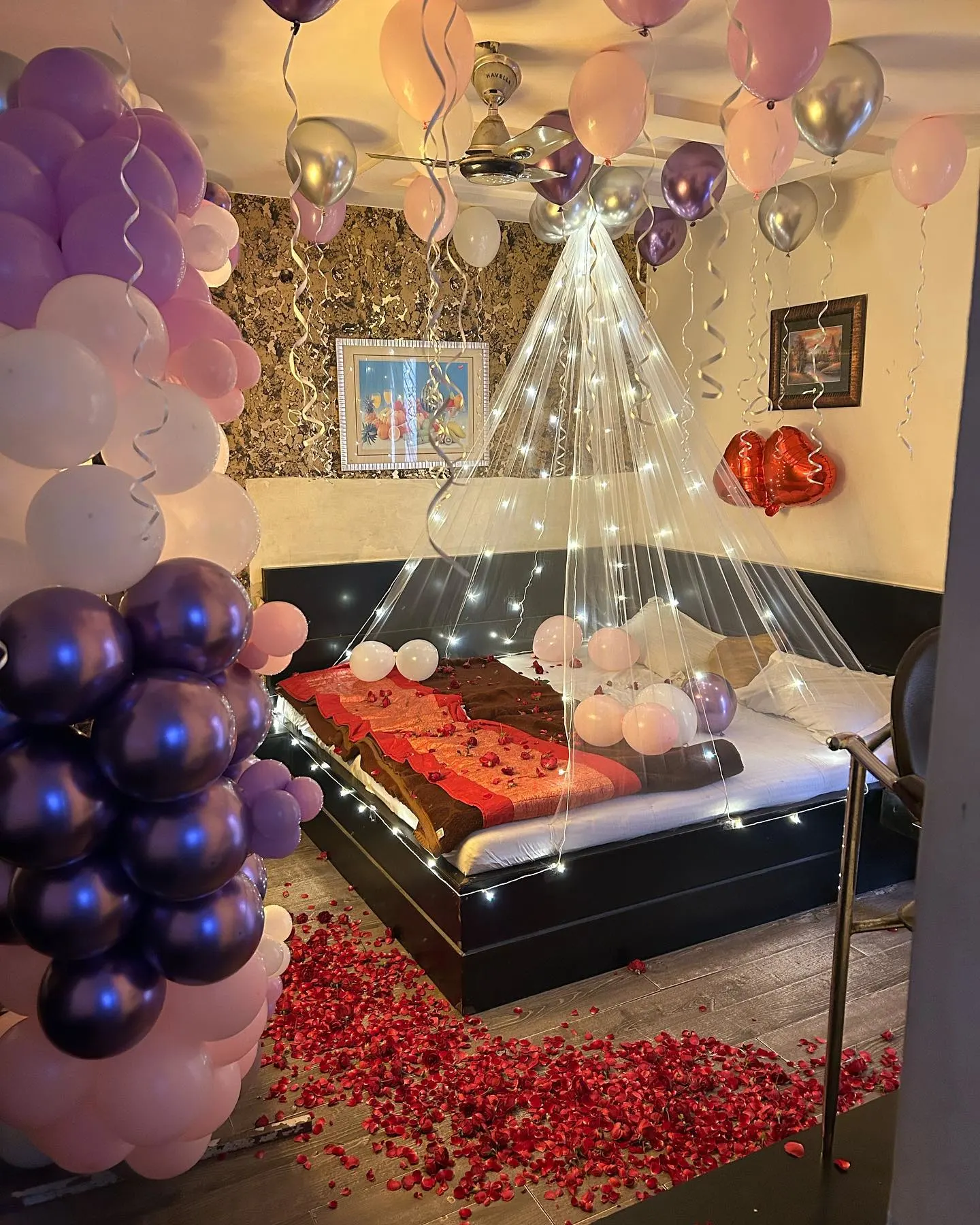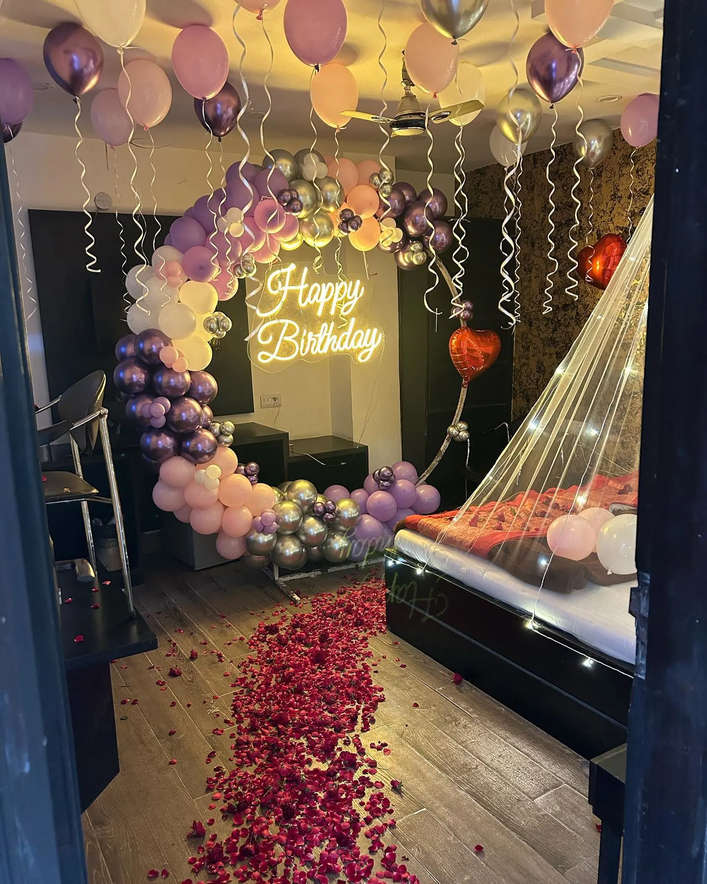 ⭐This grand birthday room decoration is designed to create an unforgettable celebration experience. The setup features a stunning balloon arch with a "Happy Birthday" neon sign, a dreamy ⭐canopy with fairy lights over the bed, and floating ceiling balloons to add elegance and charm. The blend of ...