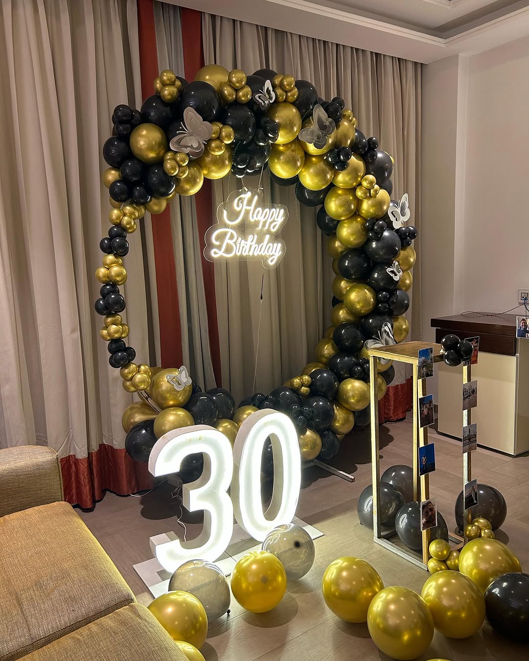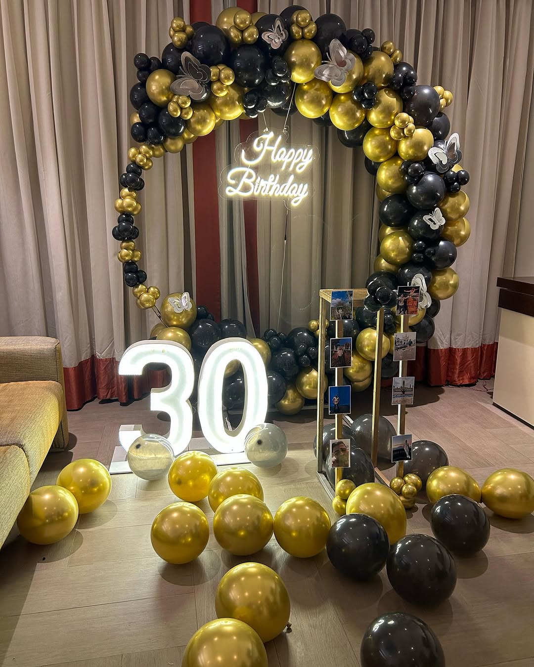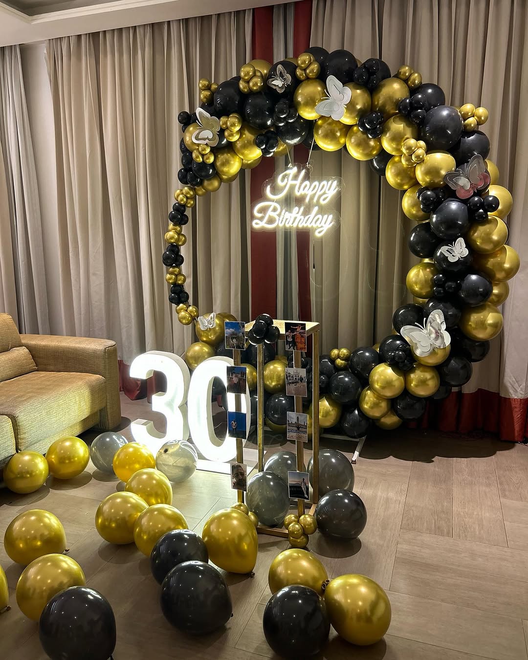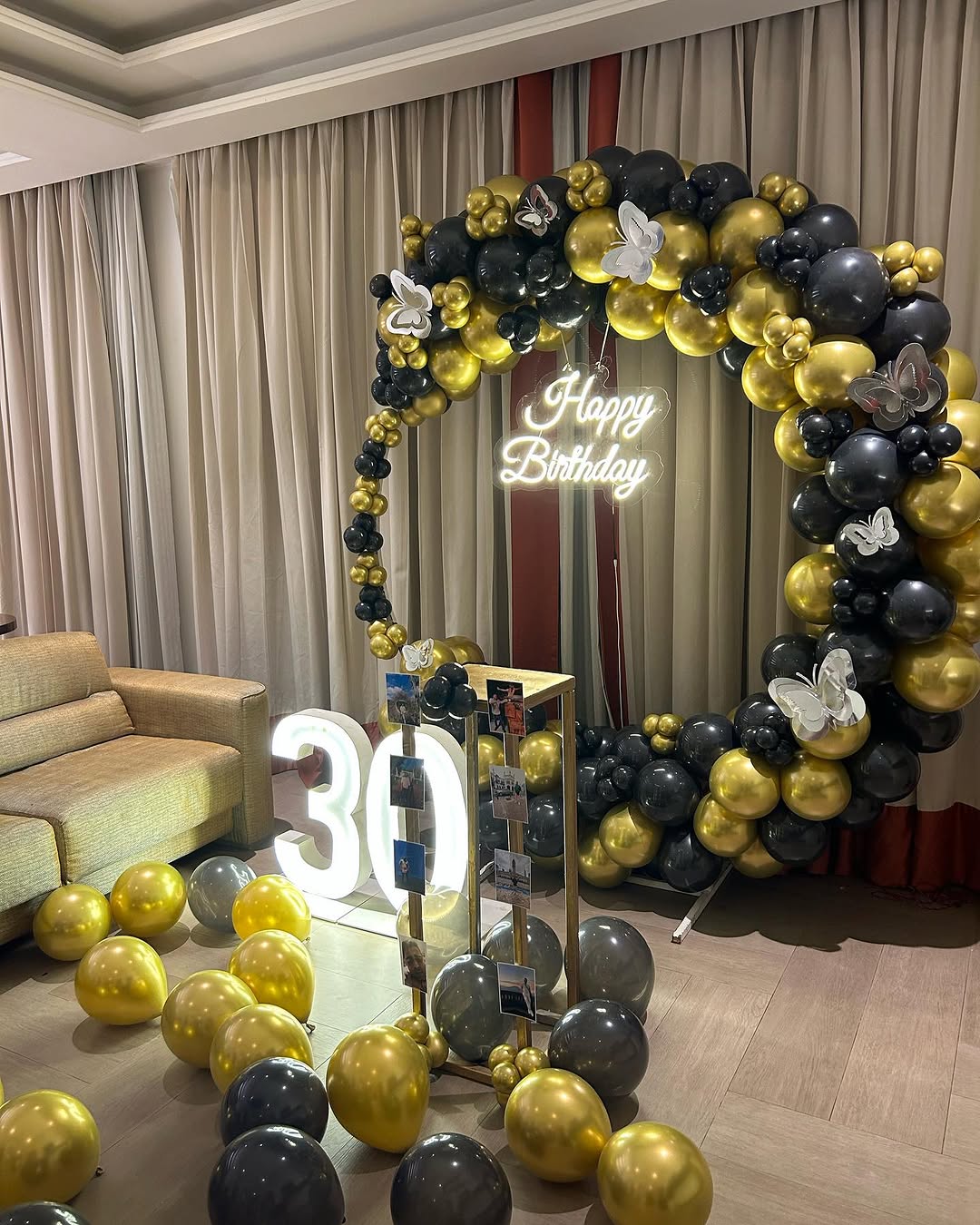 This stunning black and gold-themed balloon arch is a perfect blend of elegance and sophistication, ideal for milestone birthdays like 30th, 40th, or even corporate events. The circular balloon arch is beautifully decorated with gold and black balloons, complemented by silver butterfly cutouts fo...