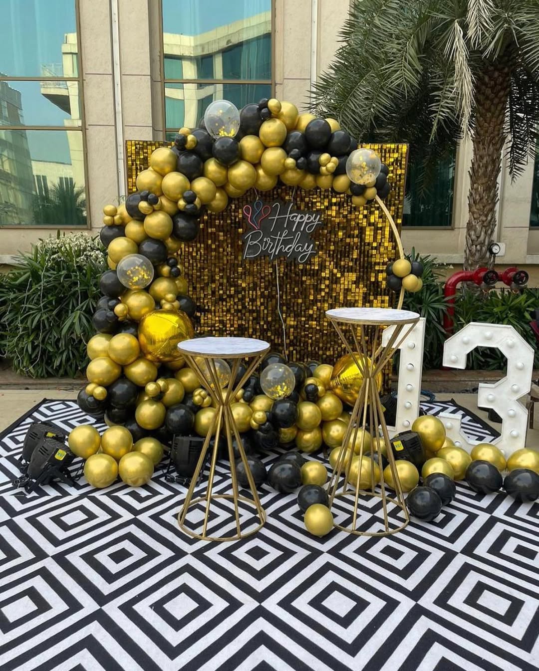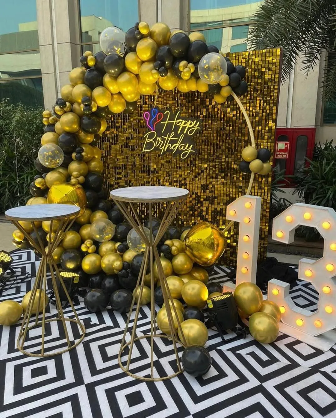 *️⃣This stunning black and gold birthday backdrop is perfect for a luxurious and classy celebration. The gold sequin panel paired with a round balloon arch in black and gold tones creates an *️⃣elegant and premium look. The neon "Happy Birthday" sign, LED marquee numbers, and stylish cocktail tab...