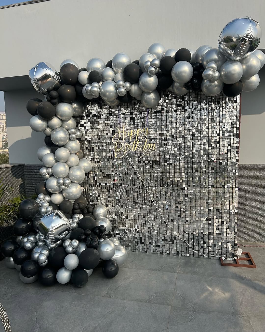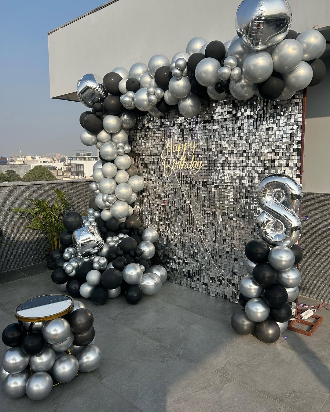 this modern and stylish black & silver-themed balloon decoration is designed for sophisticated birthday celebrations. It features a sequin shimmer backdrop with a glowing "Happy Birthday" neon sign, creating a dazzling and elegant ambiance. The balloon arrangements in silver and black tones a...