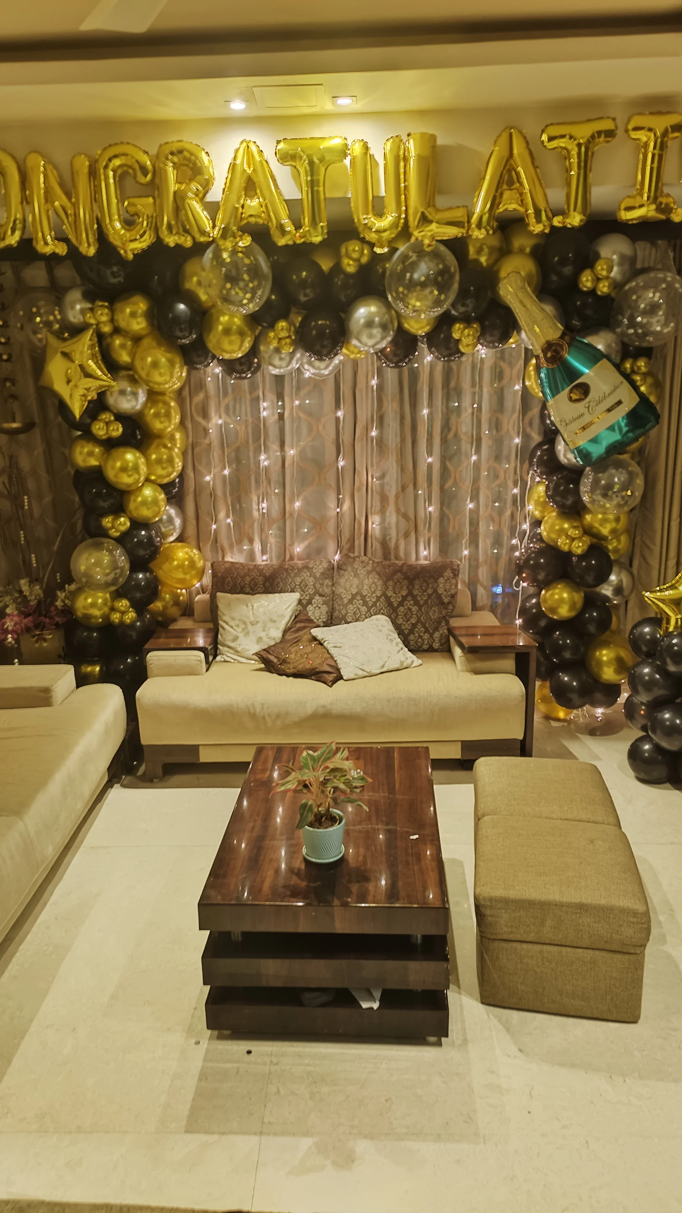 *️⃣This is a luxurious and elegant balloon backdrop designed for celebrations like promotions, achievements, anniversaries, or special milestones. The color scheme consists of gold, black, and *️⃣silver, creating a premium, glamorous look. The backdrop includes: