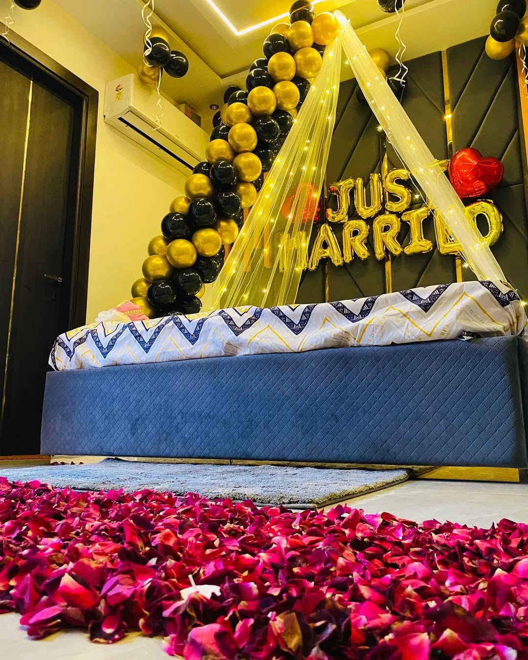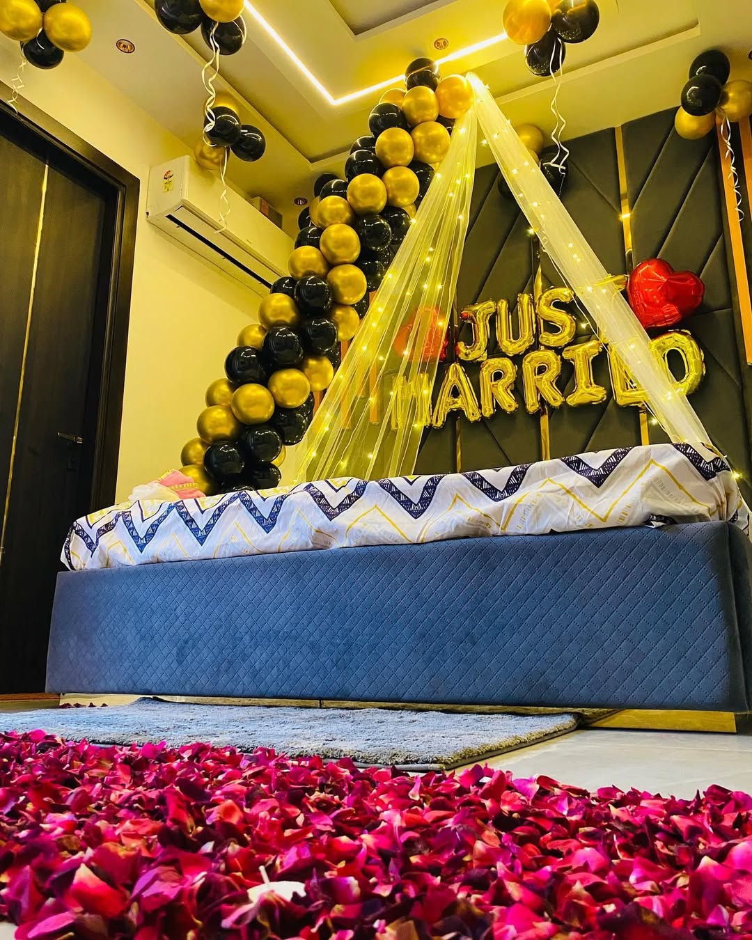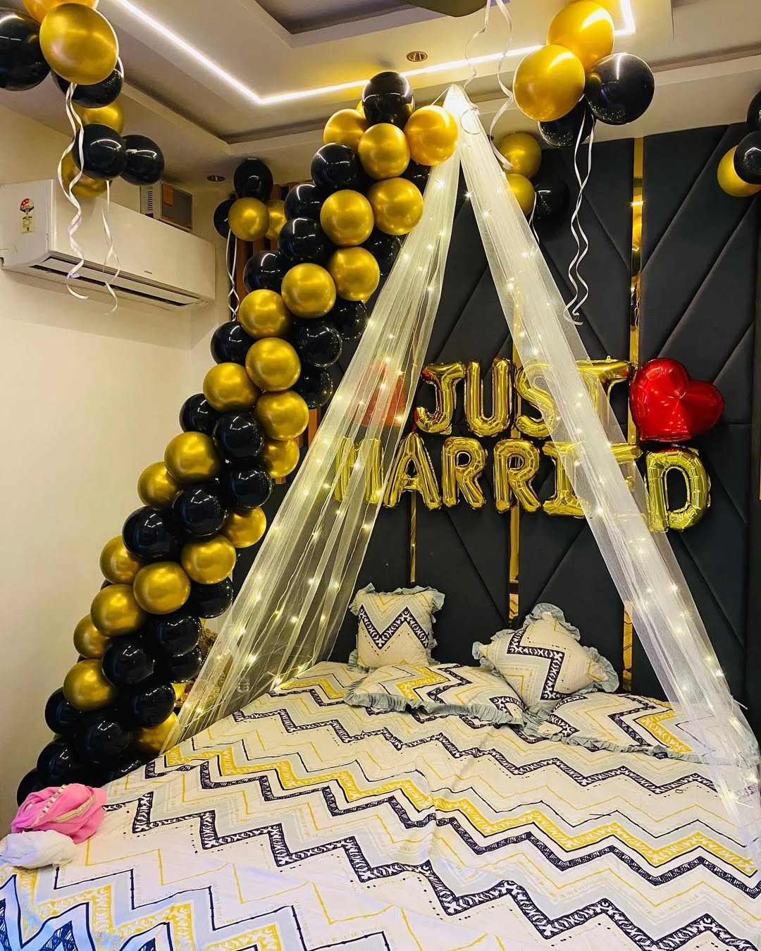 This elegant "Just Married" room decoration is a perfect setup for newlyweds, designed with a luxurious black and gold balloon arch that cascades gracefully over the bed. The decor is complemented by soft fairy lights and delicate white draping, adding a romantic and dreamy ambiance. Red heart-sh...