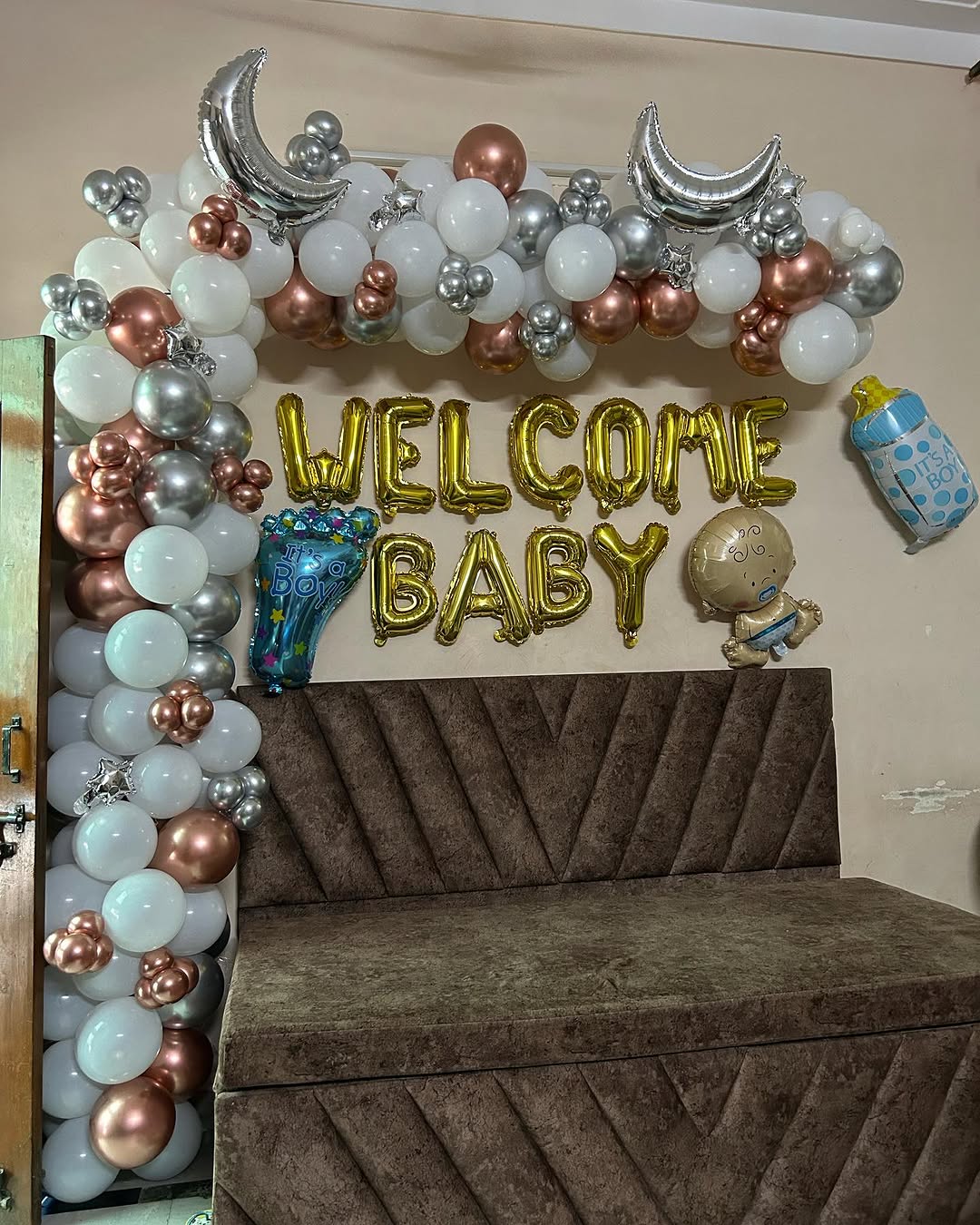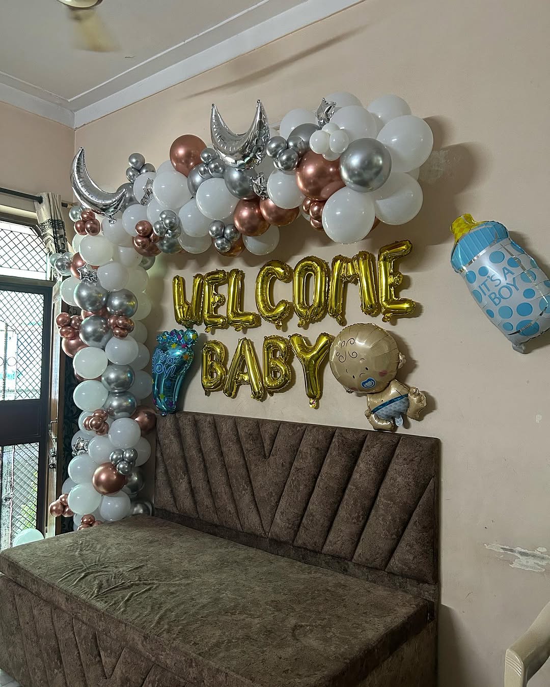 *️⃣This elegant and dreamy baby welcome decoration is designed to create a magical atmosphere for celebrating the arrival of a newborn baby. The gold "WELCOME *️⃣BABY" foil balloons serve as the main highlight, placed under an extravagant moon and star-themed balloon arch.
