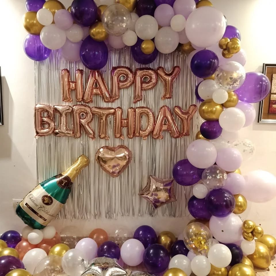 This elegant and stylish birthday decoration features a purple, gold, and white balloon garland, combined with a silver fringe backdrop and rose gold "HAPPY BIRTHDAY" letter balloons. The setup is perfect for milestone birthdays or luxurious birthday celebrations, creating a glamorous and celebra...