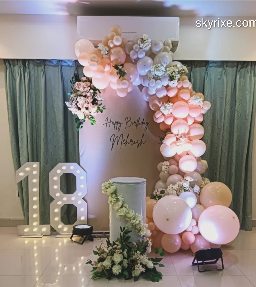 Step into a graceful milestone celebration space where soft pastels and fresh florals create a timeless birthday atmosphere. The gentle balloon cascade and botanical accents evoke a blooming garden feel, symbolizing growth and new beginnings at eighteen.