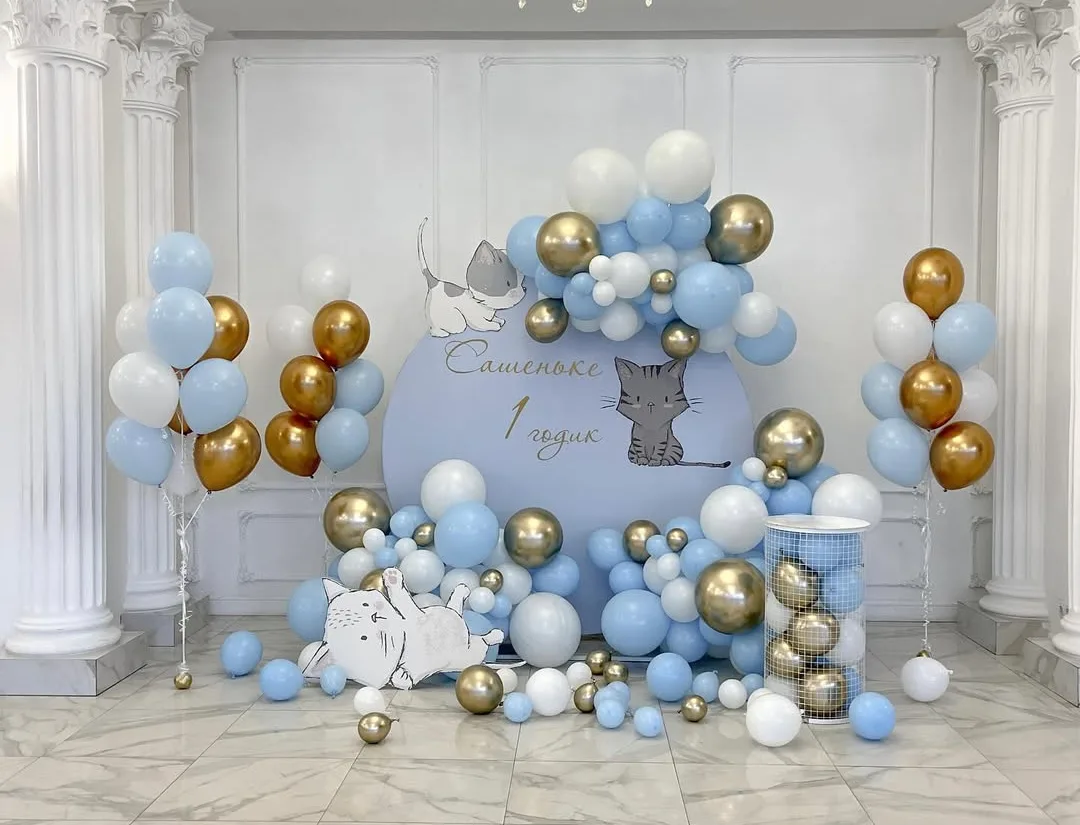 ✅Balloon Garland Arch (Pastel blue, white, metallic gold, chrome white)