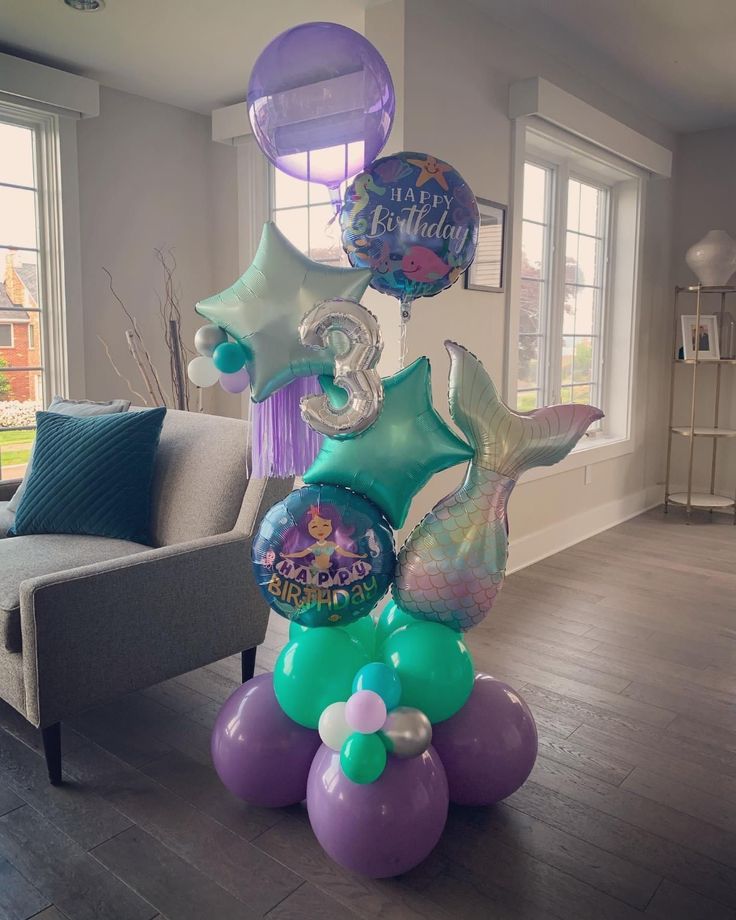 A vibrant mermaid-themed balloon tower designed to bring an oceanic fantasy to life. Featuring a mix of foil balloons in the shape of stars, a shimmering mermaid tail, a large number balloon, and printed “Happy Birthday” balloons, this design stands tall as an eye-catching centerpiece. The base i...