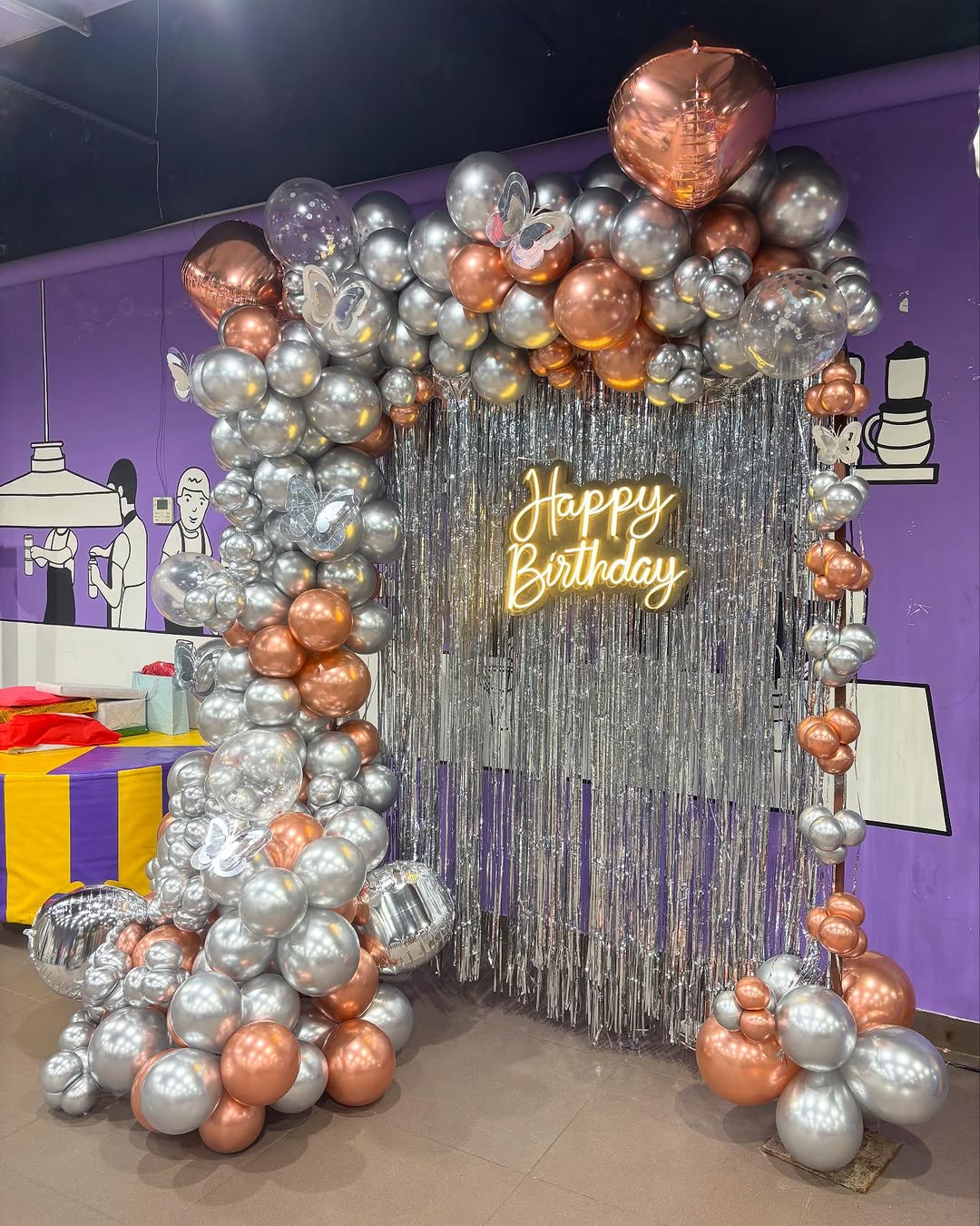 This luxurious balloon decoration features a sophisticated color palette of silver, rose gold, and chrome balloons. The shimmering silver fringe curtain combined with a "Happy Birthday" neon sign makes it a perfect choice for milestone birthdays, adult celebrations, or even anniversary parties. T...