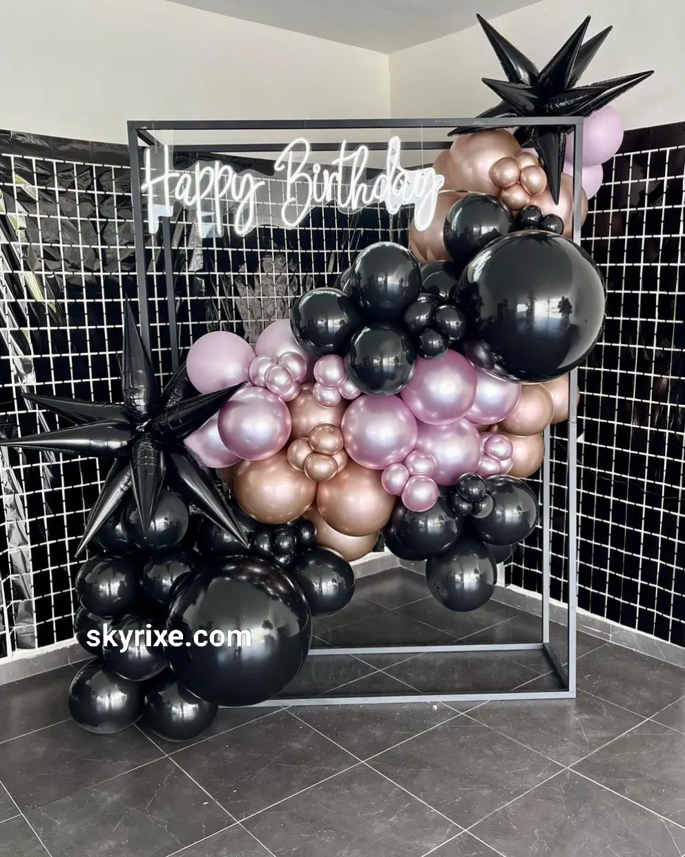 Elevate your celebration with our Midnight Chrome Luxe Birthday Frame, a bold modern balloon backdrop featuring deep black chrome, mauve pearl, and champagne metallic balloons styled across a sleek metal cube frame. Accented with dramatic 3D black starburst foils and a glowing “H...