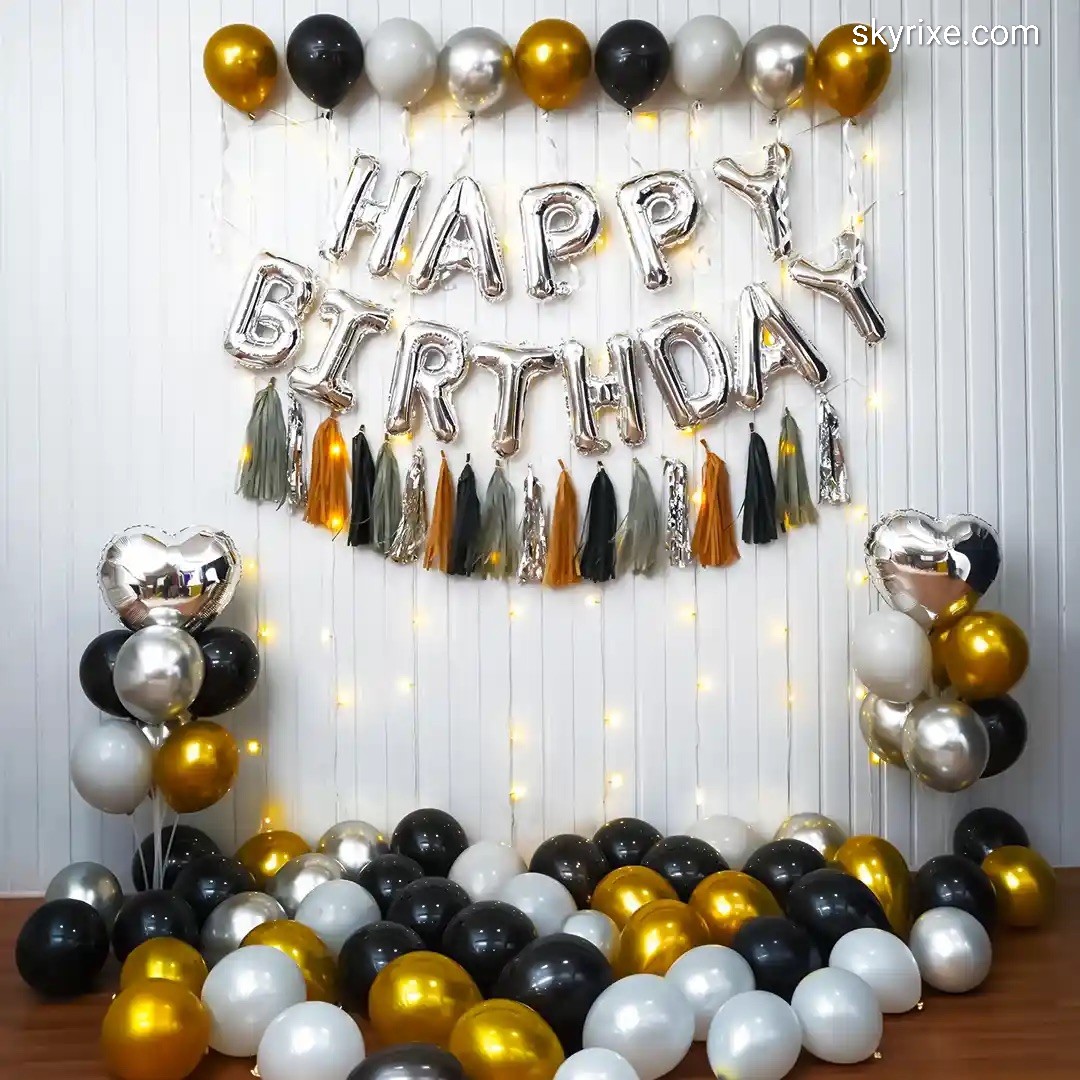 Create a luxurious party vibe with our Midnight Gold Birthday Backdrop Décor. This elegant setup features shimmering silver “Happy Birthday” foil balloons framed with black, gold, and silver latex balloons, warm fairy lights, and stylish tassel garlands.