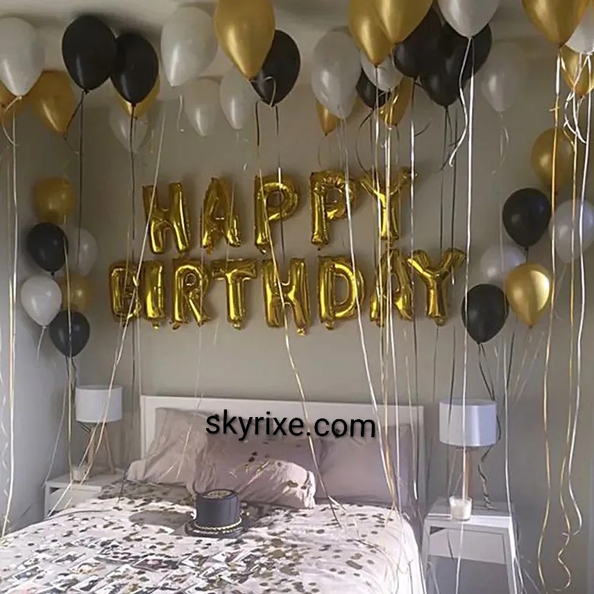 Walk into a dramatic midnight celebration vibe with floating balloons and a golden birthday backdrop. The monochrome luxury palette creates a premium, Instagram-worthy surprise moment—ideal for partners, friends, or milestone birthdays.