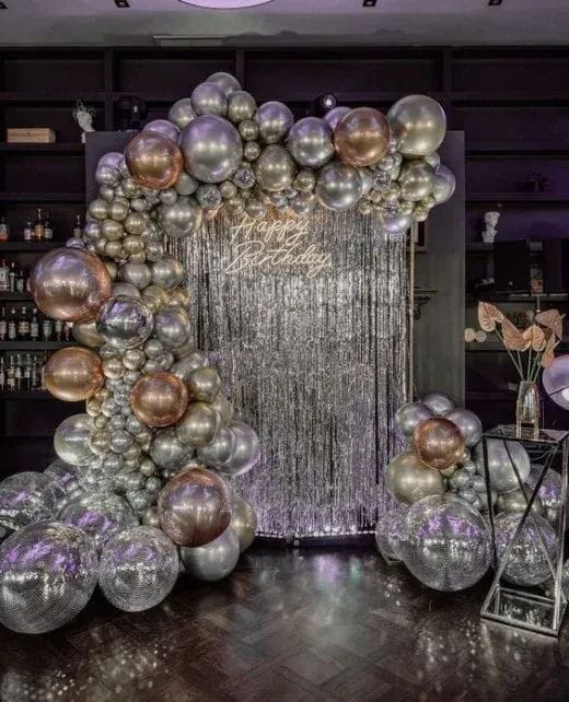 An ultra-glamorous, party-perfect backdrop featuring a metallic silver, chrome gold, and rose gold balloon garland. Paired with a silver foil fringe curtain and sparkling disco balls, this design screams high-end celebration. It’s best for birthday parties, luxury events, or nightlife themes—brin...
