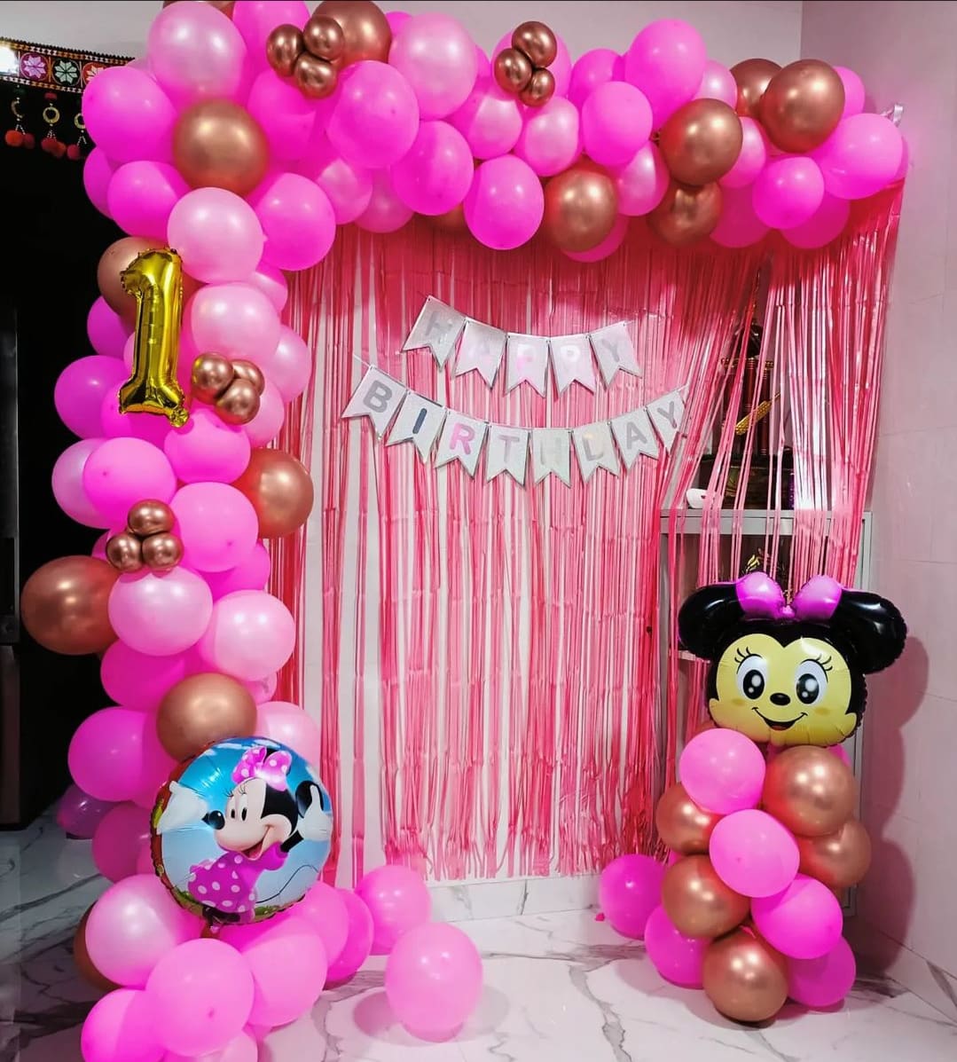 This adorable Minnie Mouse-inspired balloon setup is perfect for a 1st birthday celebration. The pink and rose gold balloon arch frames a shimmering pink fringe curtain backdrop, adding a fun and festive atmosphere. The gold foil number "1" balloon highlights the special milestone, while the Minn...