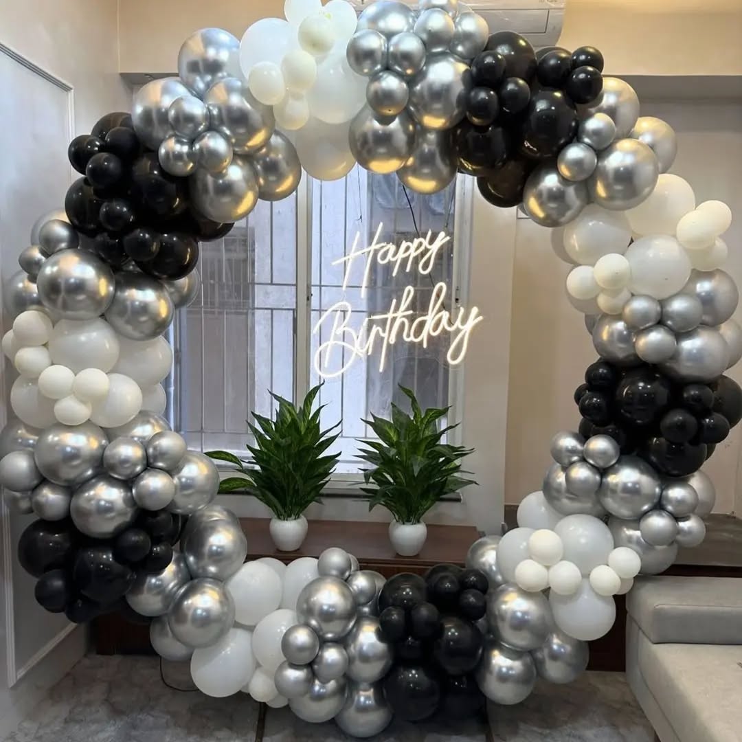 The Modern Monochrome Birthday Arch is a sleek and elegant balloon display using a classic black, white, and silver palette. The metallic silver balloons add a luxurious touch, while the black and white create a stylish contrast. The "Happy Birthday" neon sign adds a modern and celebratory feel, ...