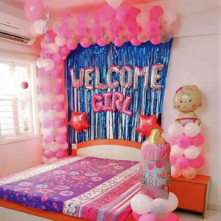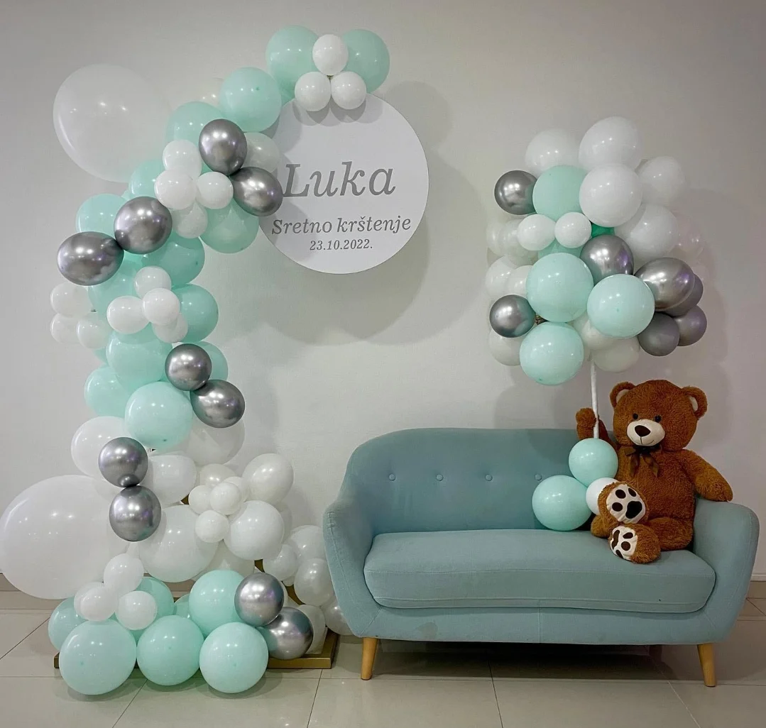 This naming ceremony decoration creates a heartwarming and peaceful celebration experience that perfectly suits the joy of welcoming a newborn baby. The soft blue tones combined with white and silver balloons create a calming environment that feels gentle and comforting. The teddy bear sitting on...