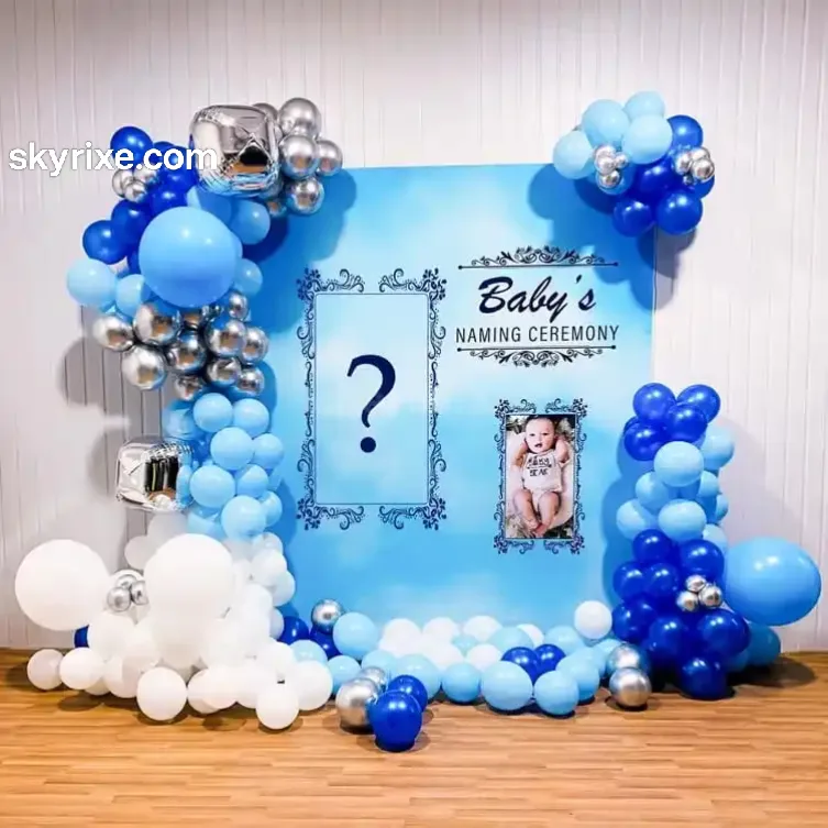Create a classy and memorable celebration with this elegant Royal Blue Naming Ceremony Decoration. Designed with a soothing combination of blue, white, and chrome silver balloons, this setup brings a premium and sophisticated look to your baby’s special day.