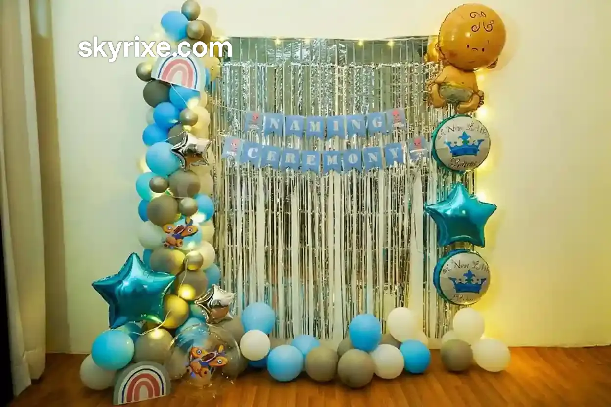 Create a classy and memorable celebration with this Blue & Gold Naming Ceremony Decoration Setup, designed to give a premium and joyful vibe. The combination of soft blue, white, and metallic gold balloons creates a perfect balance of elegance and celebration.