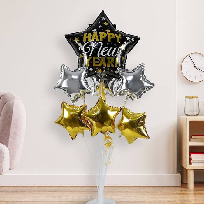 A stunning and festive balloon arrangement designed to bring glamour and excitement to your New Year's Eve celebration. This bouquet features a large black star-shaped foil balloon with "Happy New Year" text in gold and silver accents, surrounded by silver and gold star balloons for an eleg...