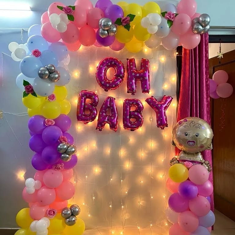 *️⃣ A charming and colorful baby shower decoration featuring a balloon arch in pastel and bright colors (pink, yellow, purple, white) with artificial flowers and silver balloon accents. The "OH BABY" *️⃣foil balloons in pink polka-dot style add a fun touch. The fairy light curtain backdrop c...