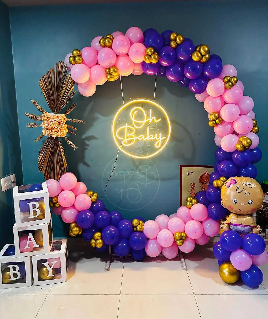 This stunning baby shower balloon arch features a pink, purple, and gold color scheme, symbolizing elegance and joy. The "Oh Baby" neon sign adds a trendy and modern touch, making it perfect for celebrating a baby shower or gender reveal party. The baby-themed foil balloon and stacked "BABY" lett...