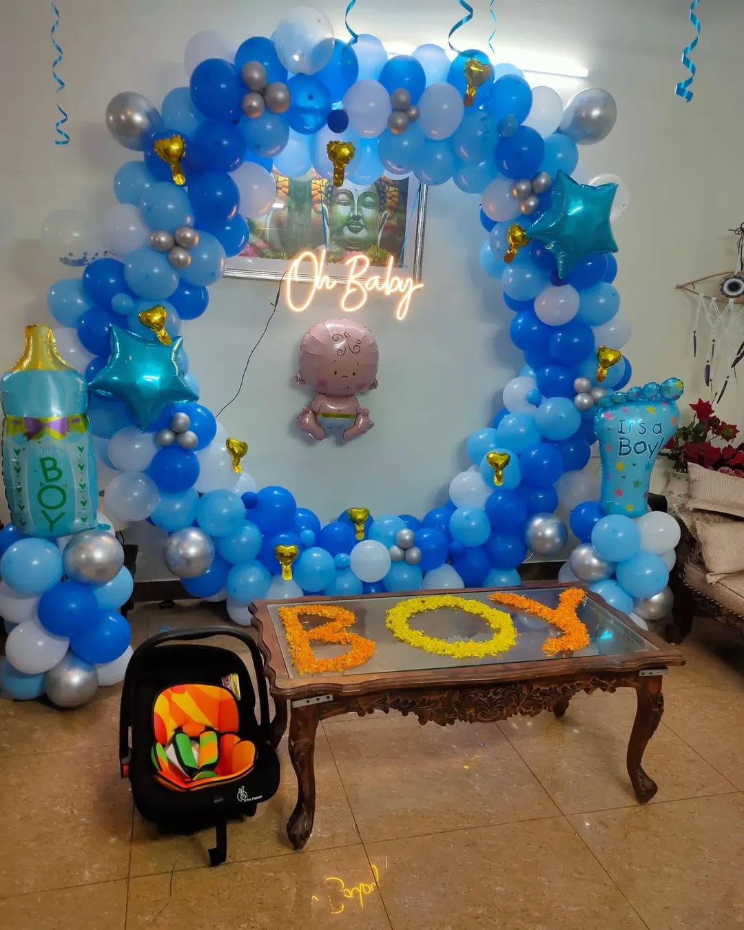 Celebrate the joy of welcoming a baby boy with this adorable blue-themed balloon setup. The design features a grand circular balloon arch in shades of blue, white, silver, and gold, along with baby-themed foil balloons, a stylish "Oh Baby" neon sign, and decorative table floral text. This setup i...