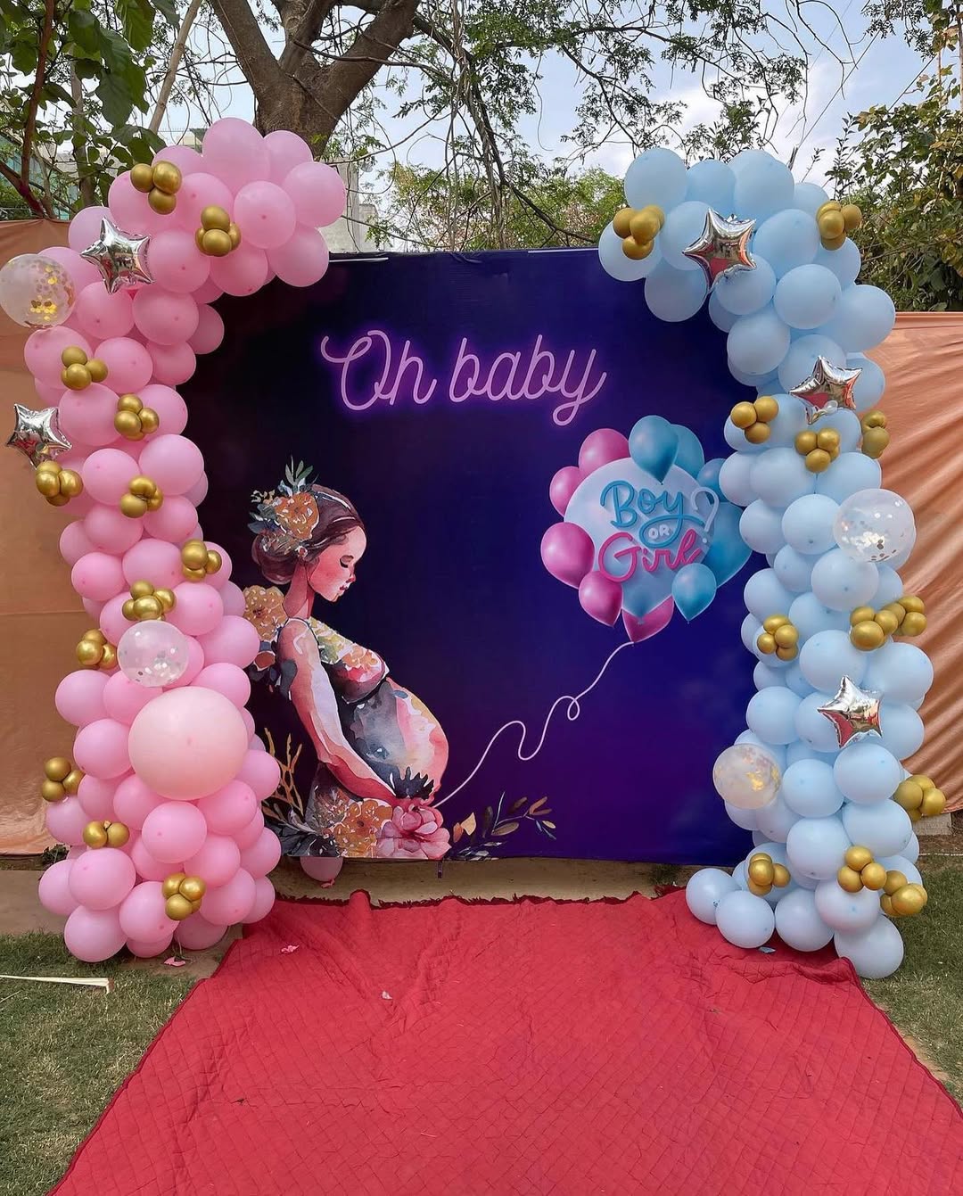 This stunning gender reveal backdrop is designed to create a magical moment for expectant parents. Featuring a split balloon arch in soft pink and blue, this design symbolizes the excitement of revealing the baby’s gender. The golden mini balloons and star foil balloons add a touch of elegance, w...