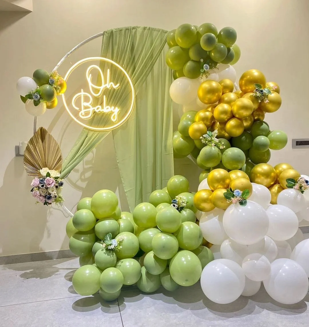 *️⃣This sophisticated yet natural baby shower setup features green, gold, and white balloons arranged around a modern circular metal stand with a soft green curtain. The neon "Oh Baby" sign adds a stylish glow, making it a perfect backdrop for baby showers, gender reveals, or elegant birthday cel...