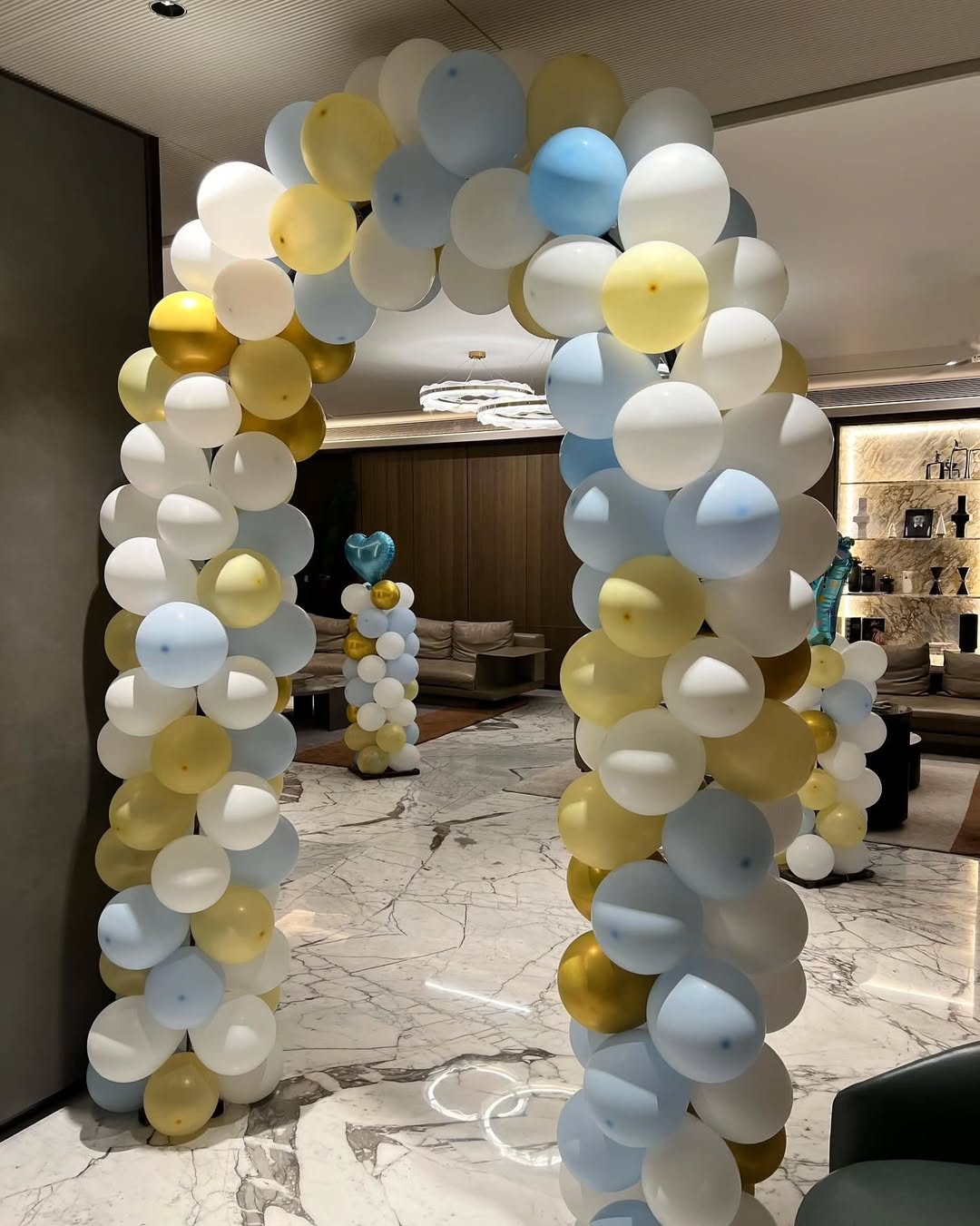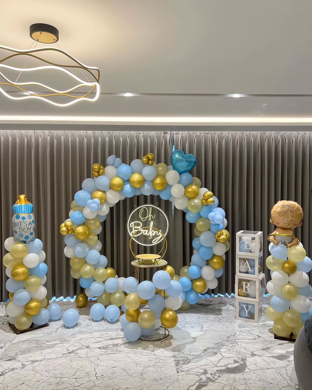 This elegant baby shower setup features a soft pastel blue, white, and gold balloon arch, creating a dreamy, gender-reveal ambiance. The "Oh Baby" neon sign is placed centrally within a circular backdrop, adding a modern, chic touch. The setup includes baby-themed props like a baby bottle balloon...