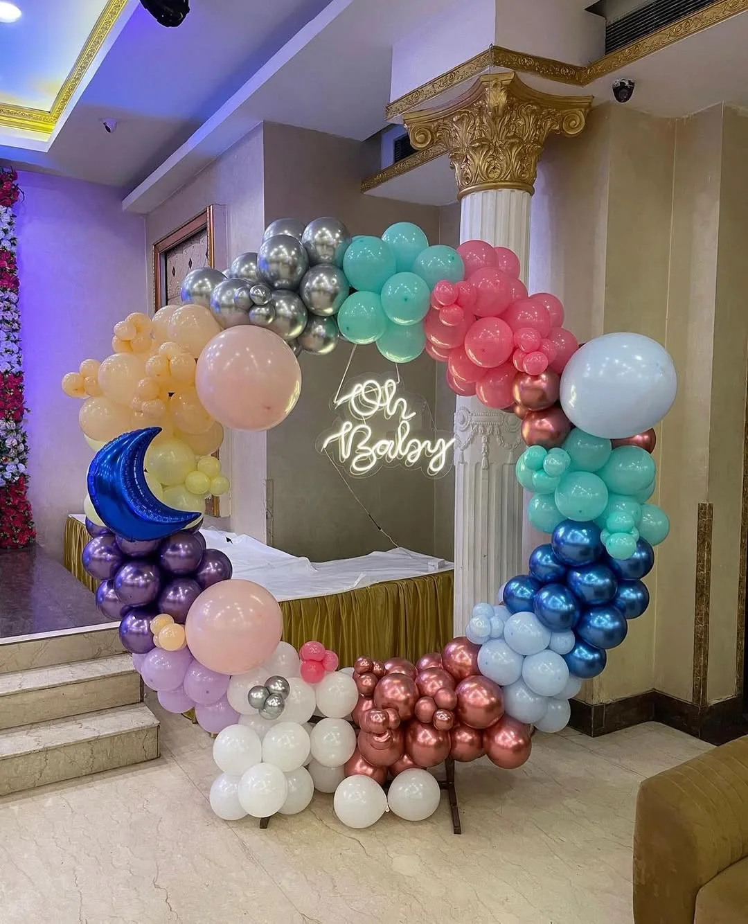 This enchanting pastel balloon crescent arch is a whimsical and dreamy baby shower setup, ideal for welcoming a baby boy or girl. The "Oh Baby" neon sign adds a glowing touch, while the crescent moon foil balloon enhances the celestial theme. The blend of pastel colors (pink, blue, yellow, purple...
