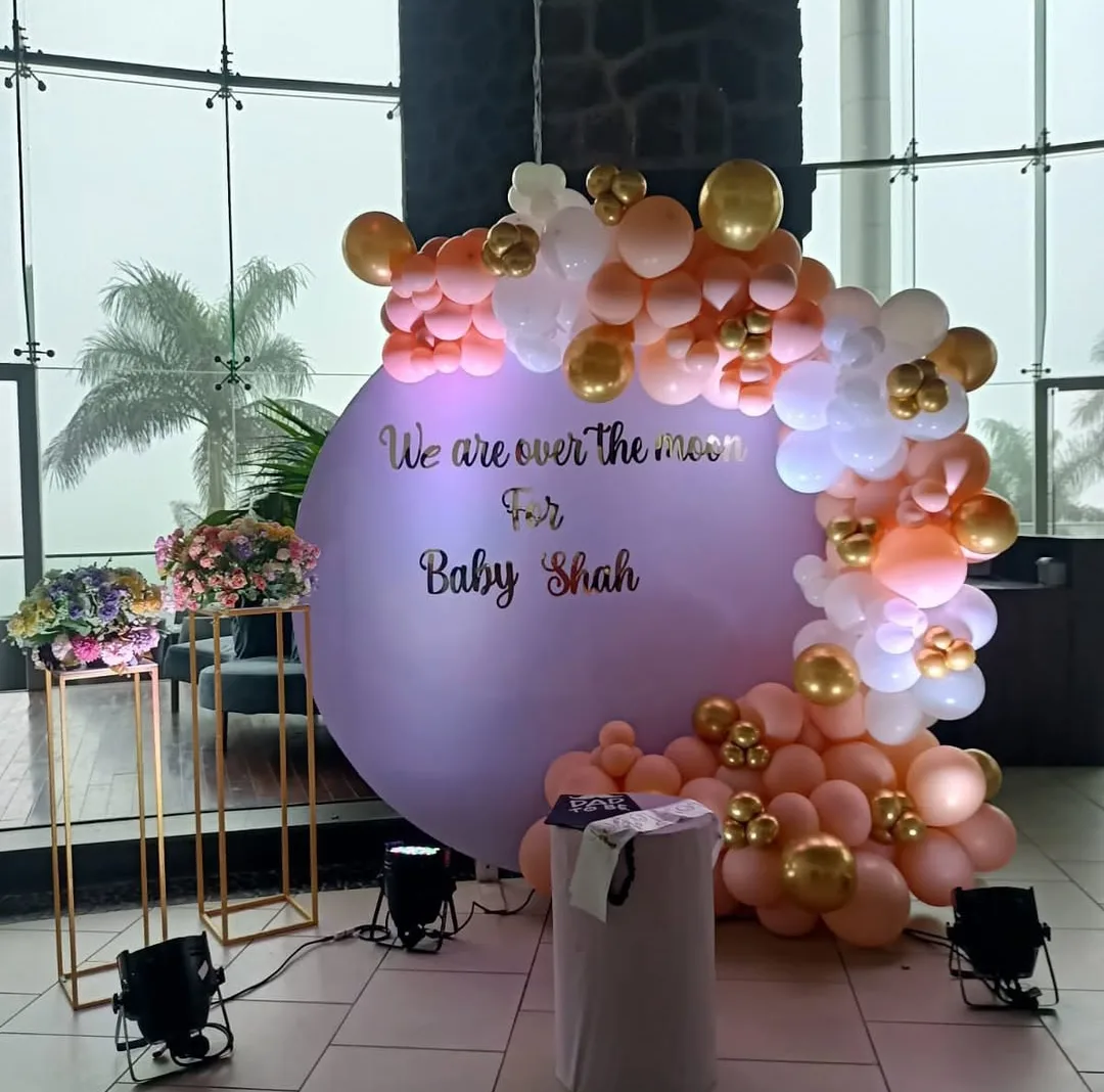 This elegant and sophisticated baby shower setup features a large circular backdrop with the phrase "We are over the moon for Baby Shah", making it perfect for a celestial-themed celebration. The balloon arrangement consists of white, peach, and gold balloons in varying sizes, forming a ...