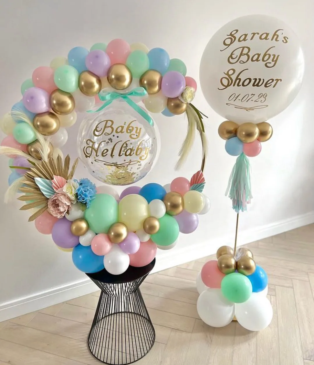 This beautifully crafted baby shower decoration features a pastel and gold balloon hoop combined with an elegant bubble balloon centerpiece. The soft pastel colors, paired with golden accents, create a dreamy and sophisticated atmosphere. The setup includes a custom "Baby Hello Baby" bubble ballo...